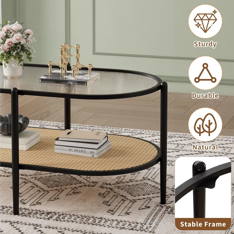 2-Tier Rattan Coffee Table, Boho Oval Coffee Table with Tempered Glass Top