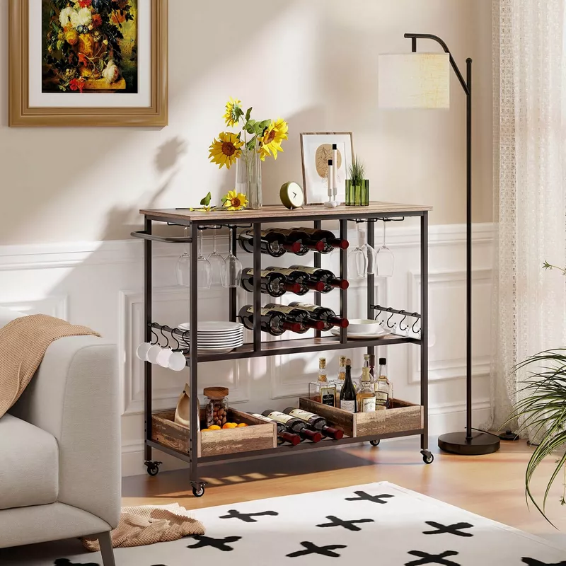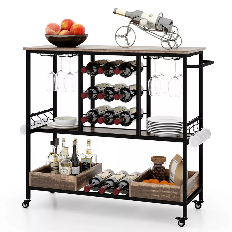 Enhance your entertaining experience with this stylish and functional 3-tier bar cart designed for home use. Built with a sturdy metal frame and elegant wooden shelves, this serving cart offers ample storage and easy mobility. The integrated glass racks keep stemware organized and within reach, while the smooth-rolling wheels allow effortless movement between rooms. Perfect for use as a bar cart, serving station, or beverage trolley, it combines practicality with modern design to complement any interior.