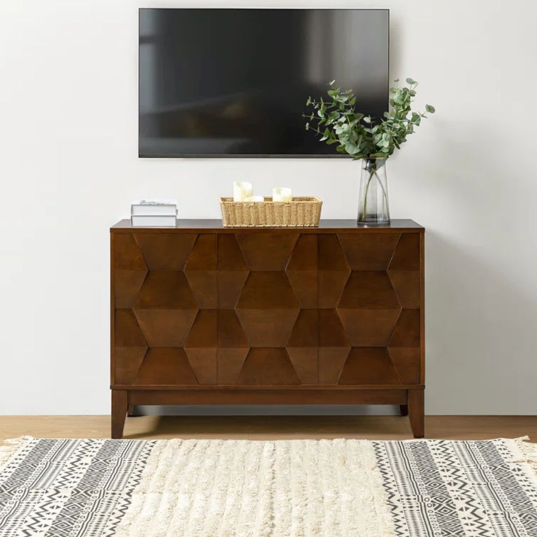 This sideboard makes a style statement with its textured design and mid-century vibe. The clean-lined frame is made from solid and engineered wood, and it rests on four tapered legs that keep sightlines clear. The three-door fronts feature captivating hexagonal embellishments, adding subtle visual texture and dimension to the overall design. And there’s plenty of room inside for all your daily essentials. Plus, the spacious surface is great as a coffee or dessert station during holiday parties and get-togethers. Hand-curated by Kelly Clarkson.