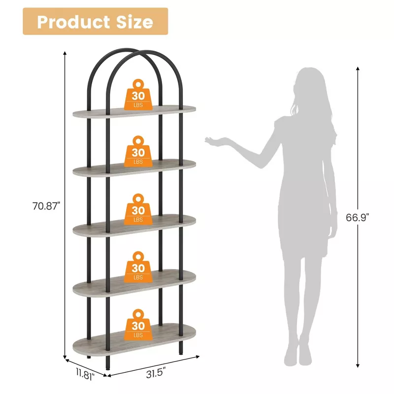 5-Tier Arched Open Bookshelf – Tall Metal Frame Display Rack for Home & Office