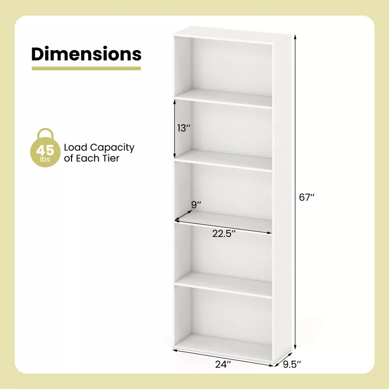 Upgrade your home or office with this stylish and functional 5-tier freestanding bookshelf. Designed with a sleek, modern look, this open bookcase provides generous storage space for books, décor, plants, photo frames, and more. Crafted from durable MDF, it offers long-lasting stability while maintaining a lightweight and elegant design.