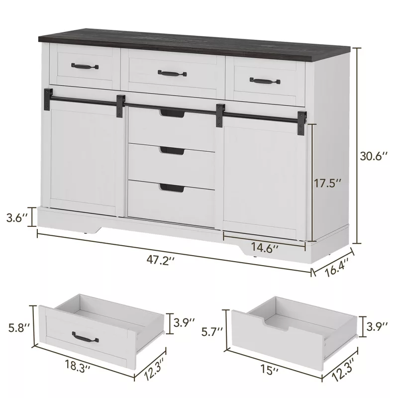 Bring rustic charm and modern functionality into your home with this Farmhouse Modern 6-Drawer Dresser with Mirror and Sliding Barn Doors. Crafted from durable wood, this dresser combines classic farmhouse design with contemporary features. The sliding barn doors add character and conceal storage, while the built-in mirror enhances convenience and visual appeal. With six spacious drawers, it provides ample space for organizing clothes, accessories, and everyday essentials. Suitable for users aged 3 years and up, adult assembly is required, with tools included for easy setup.