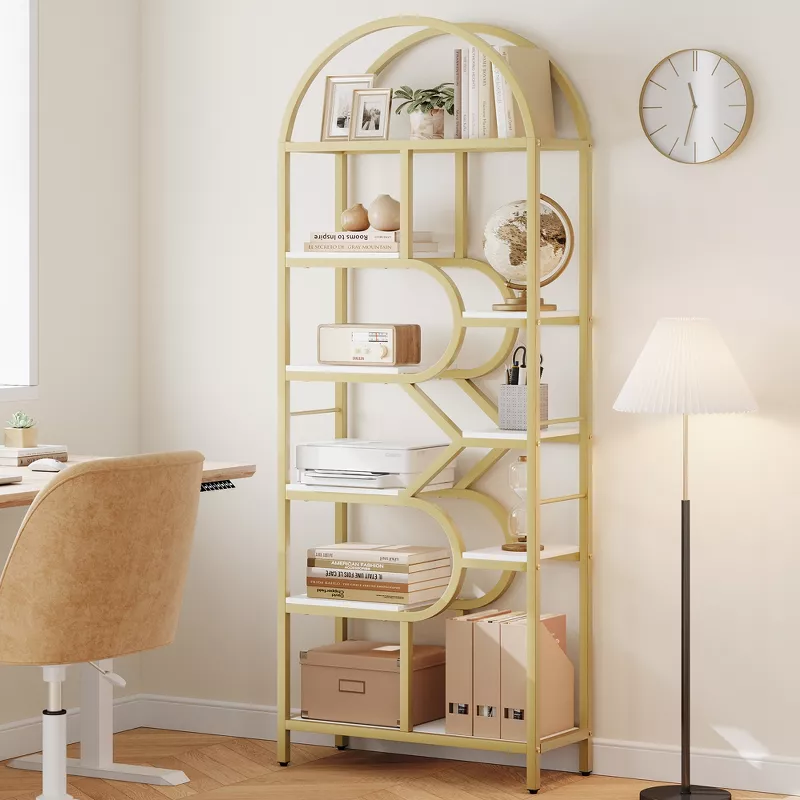 Enhance your living space with this elegant 6-tier arched bookcase designed to blend modern style with everyday functionality. Featuring a graceful arched top and geometric open shelves, this tall display rack offers a beautiful way to organize and showcase books, plants, décor, and collectibles. Its open design keeps your space feeling light and spacious while adding a stylish focal point to any room.