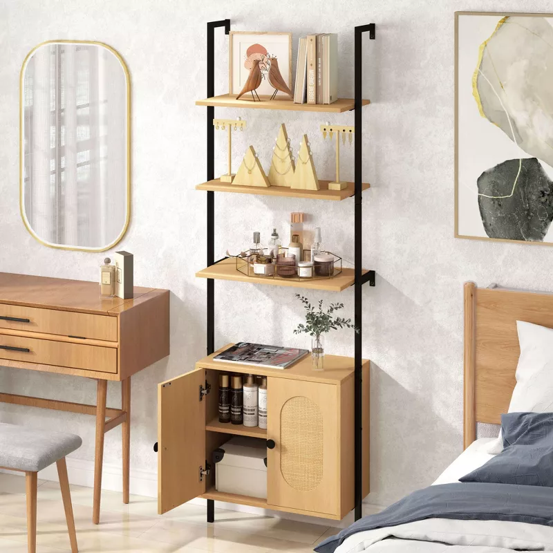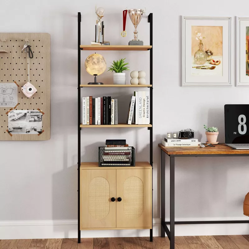71″ Ladder Bookshelf with Rattan Cabinet – Wall-Mounted Natural Wood Bookcase