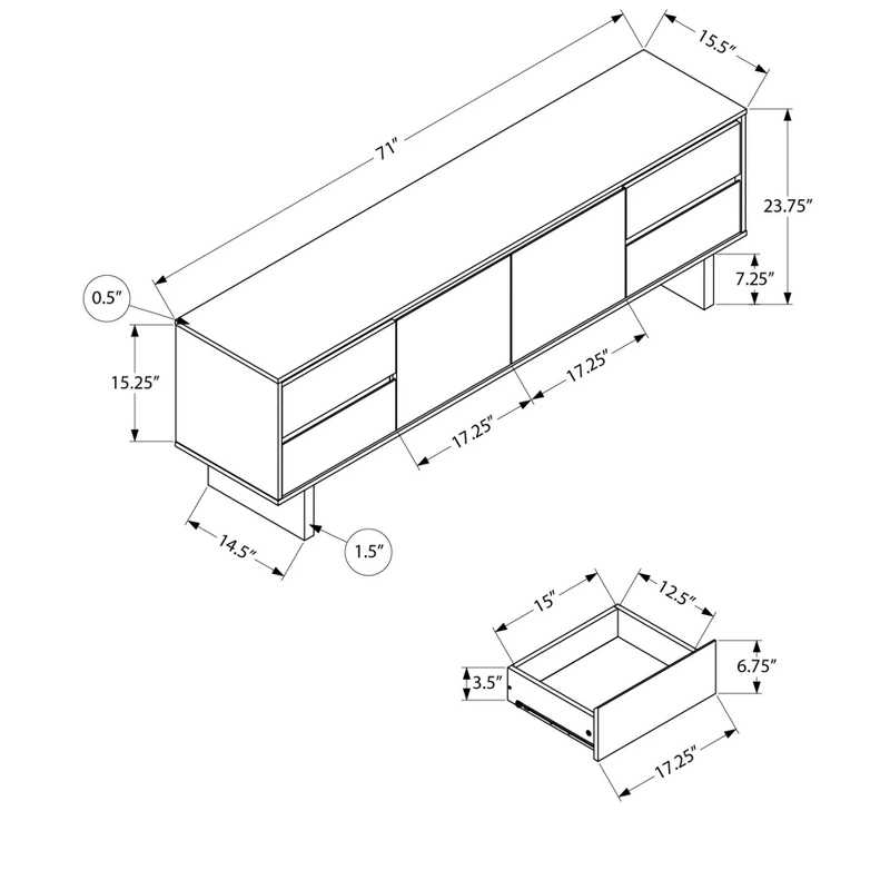 Overall Dimensions: 23.75 inches (H) x 71 inches (W) x 15.5 inches (D)