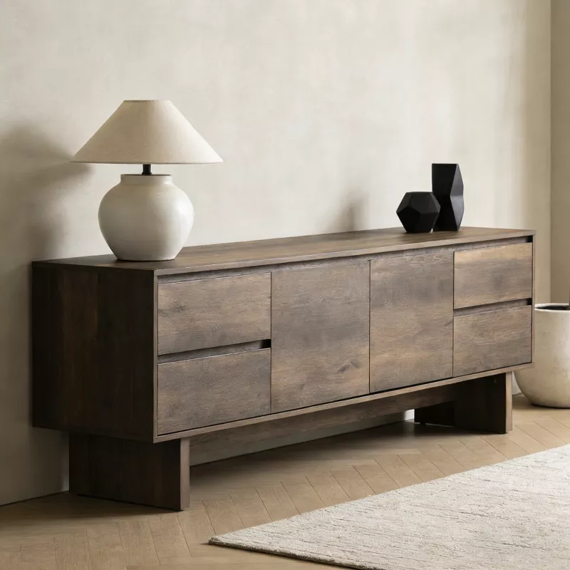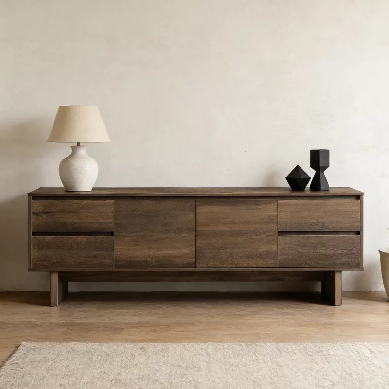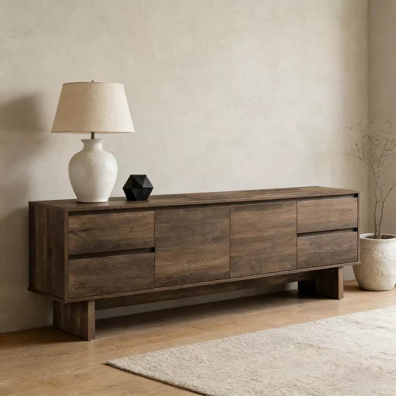 Enhance your living room with this 72-inch TV stand console designed to combine strength, storage, and modern style. Featuring a wide surface that supports large televisions, this entertainment center is crafted with a sturdy wood frame and durable MDF construction. Doors and drawers provide versatile storage for media devices, accessories, and everyday essentials, while natural metal hardware adds a refined, contemporary touch. Ideal for modern and transitional interiors, this console delivers both functionality and visual appeal.