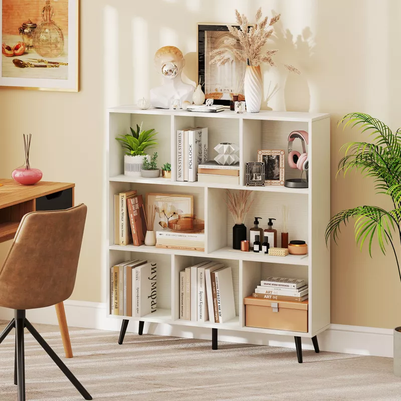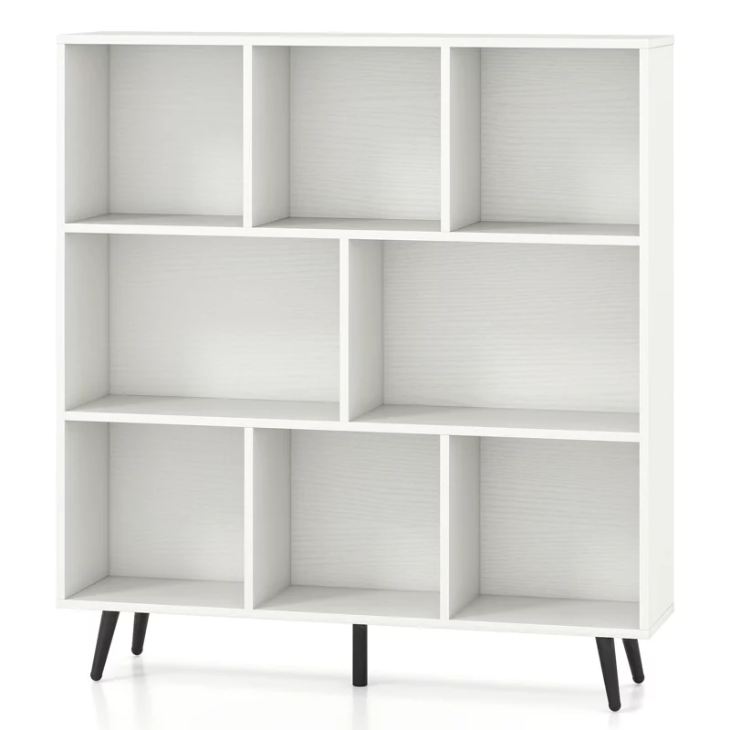 Organize your space in style with this modern 8-cube bookcase designed for both storage and display. Featuring a clean, contemporary look with five sturdy metal legs, this storage organizer adds a sleek and minimalist touch to any room. Its wide and low-profile design makes it perfect for living rooms, bedrooms, offices, or playrooms.
