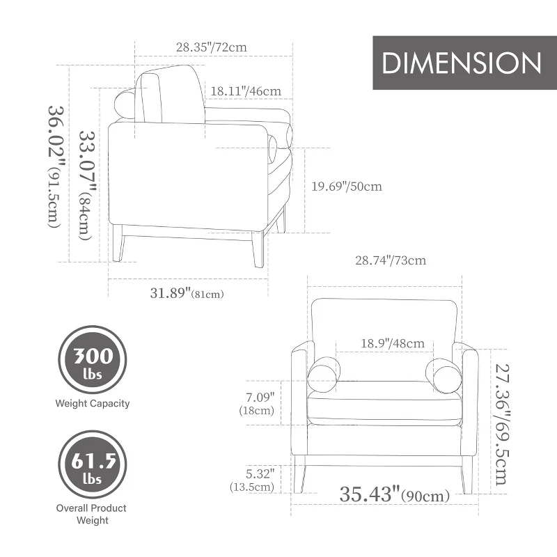 Seat Dimensions: 28.74″ W × 18.11″ D × 19.69″ H (floor to seat top)