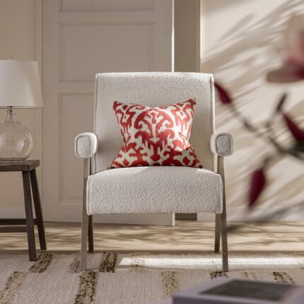 Modern accent chair upholstered in soft, textured bouclé fabric