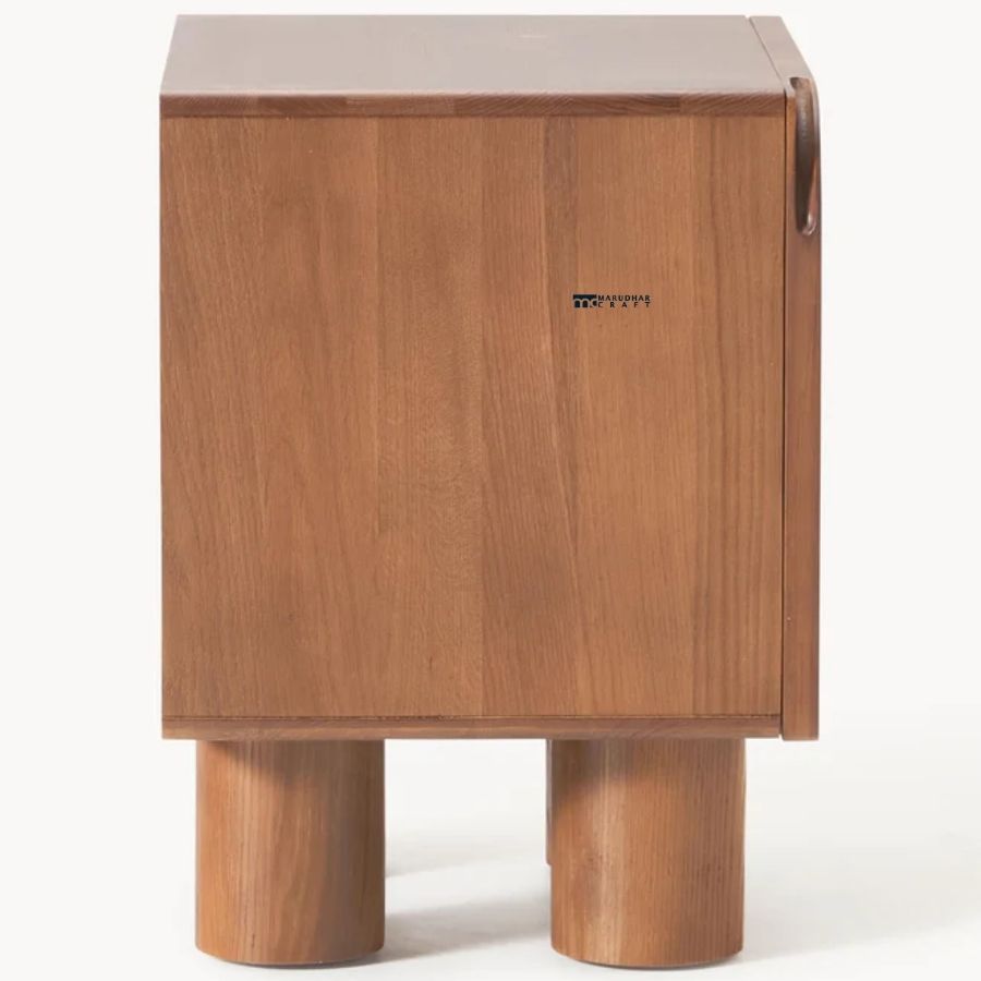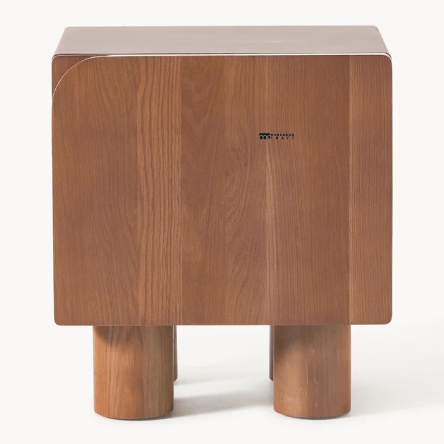 This statement-making nightstand features a bold, geometric design that emphasizes the natural beauty of solid wood. The clean cube-shaped body is elevated by four oversized cylindrical pillar legs, creating a playful yet sophisticated silhouette. Its minimalist form allows the rich grain patterns to take center stage, making it an ideal choice for high-end modern or brutalist-inspired bedroom designs.
