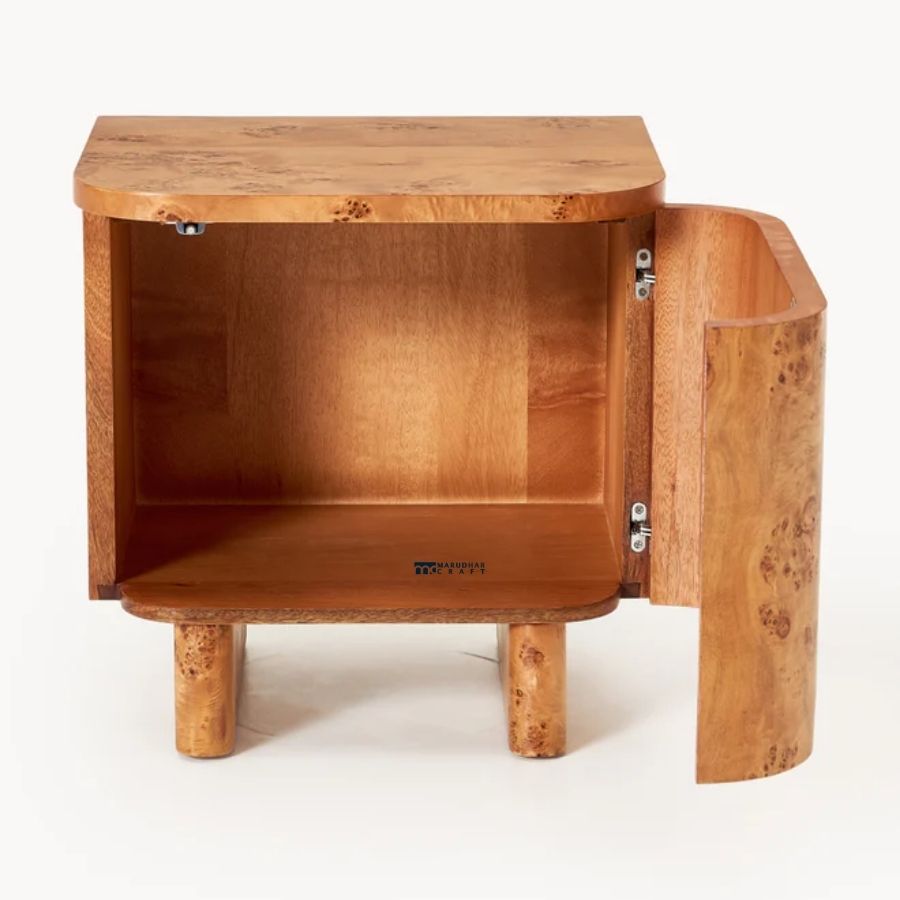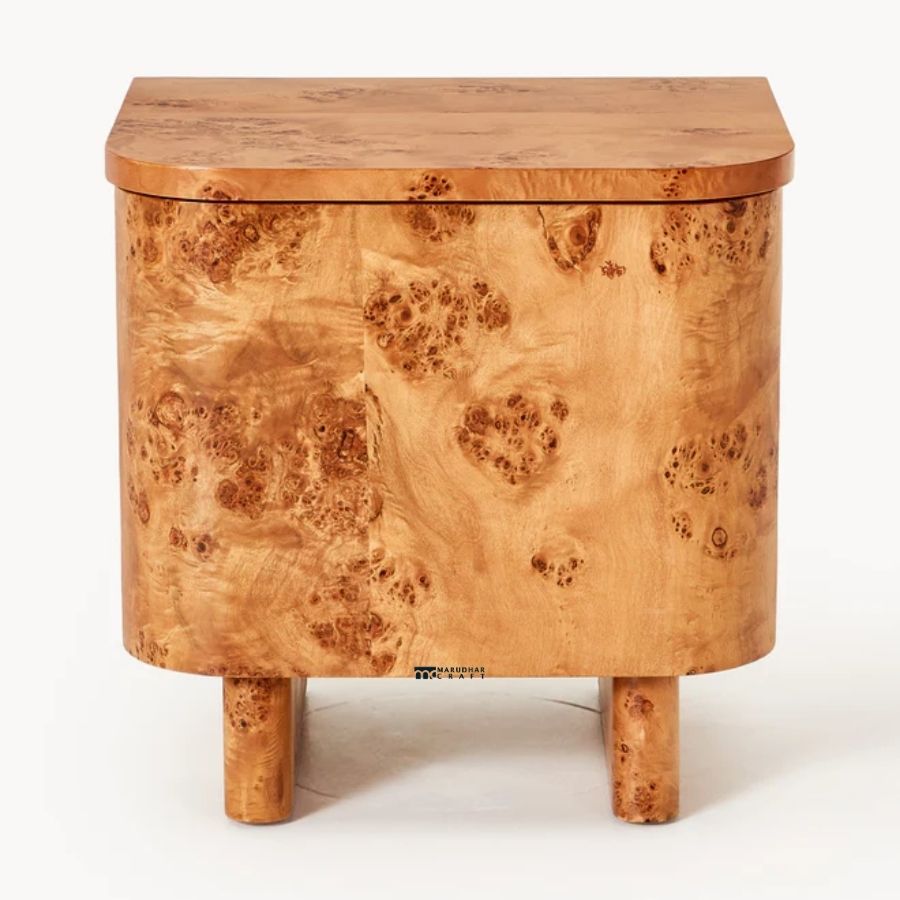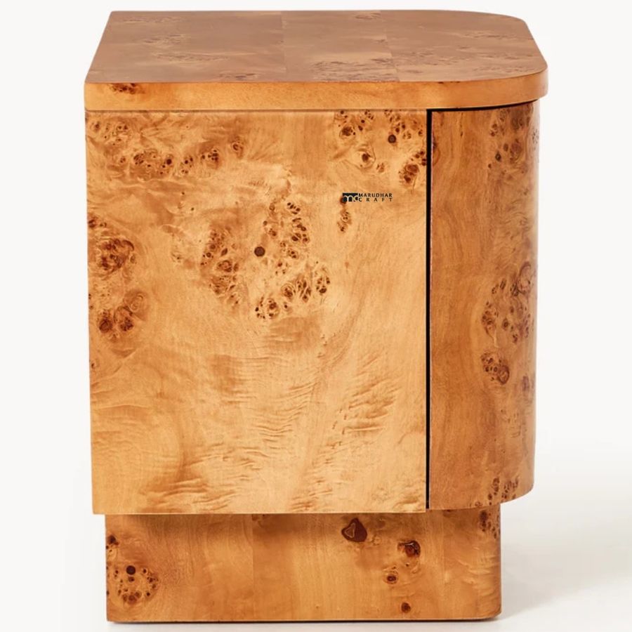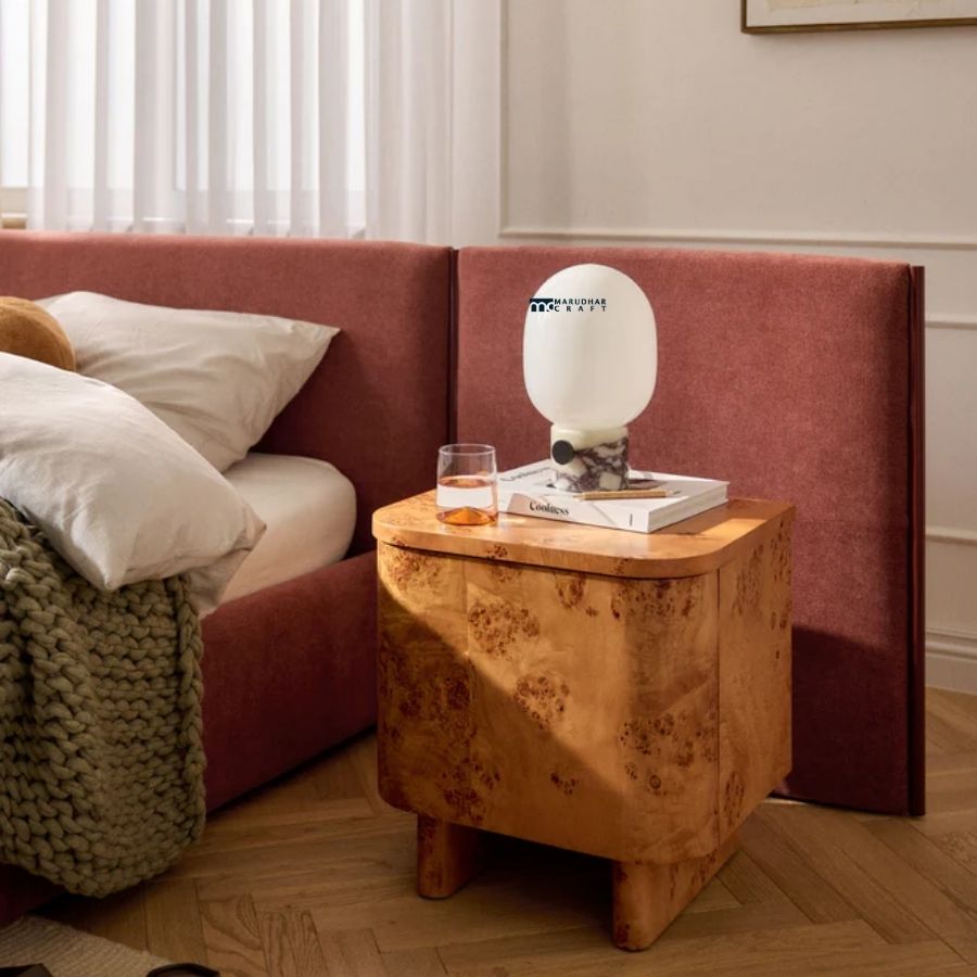 This exquisite nightstand celebrates the organic beauty of natural grain, featuring a stunning burl wood veneer that showcases intricate, swirling patterns. Its unique silhouette is defined by soft, rounded corners and thick, integrated block feet, creating a grounded yet sophisticated presence. Designed as a statement piece, this bedside table seamlessly blends mid-century warmth with contemporary sculptural forms, making it a focal point for any upscale bedroom retreat.