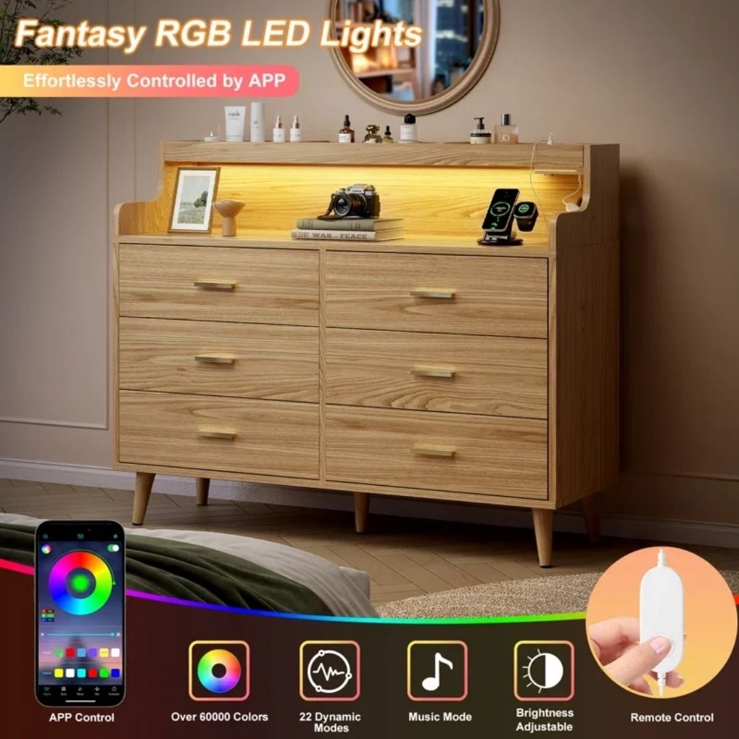 This versatile storage dresser combines sleek design with practical functionality. Featuring a unique S-frame design, it offers two spacious shelves and six drawers for efficient organization. The built-in LED light strip, adjustable via remote or smartphone app, creates the perfect ambiance. Conveniently designed with 2 outlets, 1 USB port, and 1 Type-C port for easy device charging. The top storage compartment is perfect for small items like cosmetics or keys. Made from durable MDF wood, this dresser is ideal for bedrooms, living rooms, or porches.