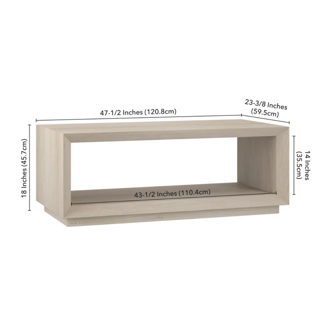 Striking in its simplicity, this modern coffee table emphasizes clean lines and a straightforward design. It’s given an extra dash of dimension thanks to beveled banding around the edges. A classic plinth base anchors the overall look, while the natural wood-grain finish adds texture and tonal variation to your living room, den, or home office. It’s crafted from engineered wood and measures just under 4′ across, giving you plenty of space up top for magazines and decor as well as books and board games on the lower shelf.