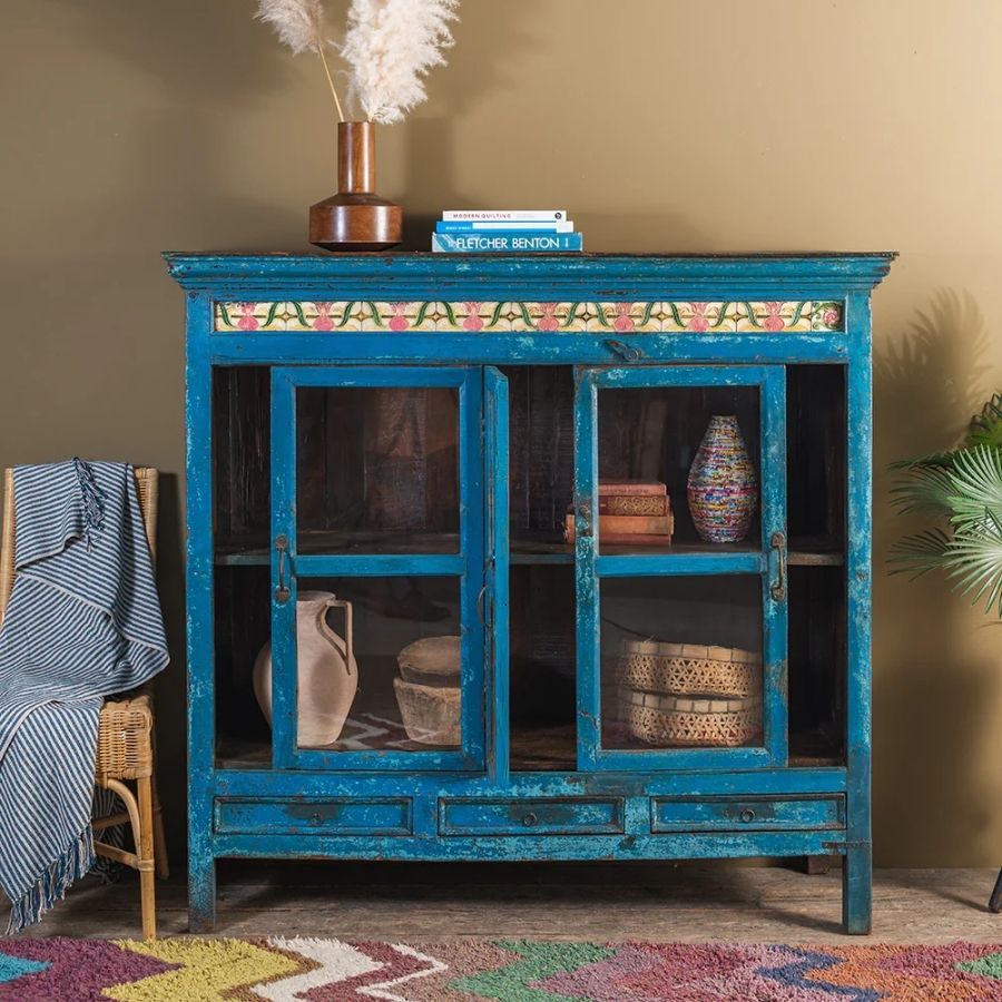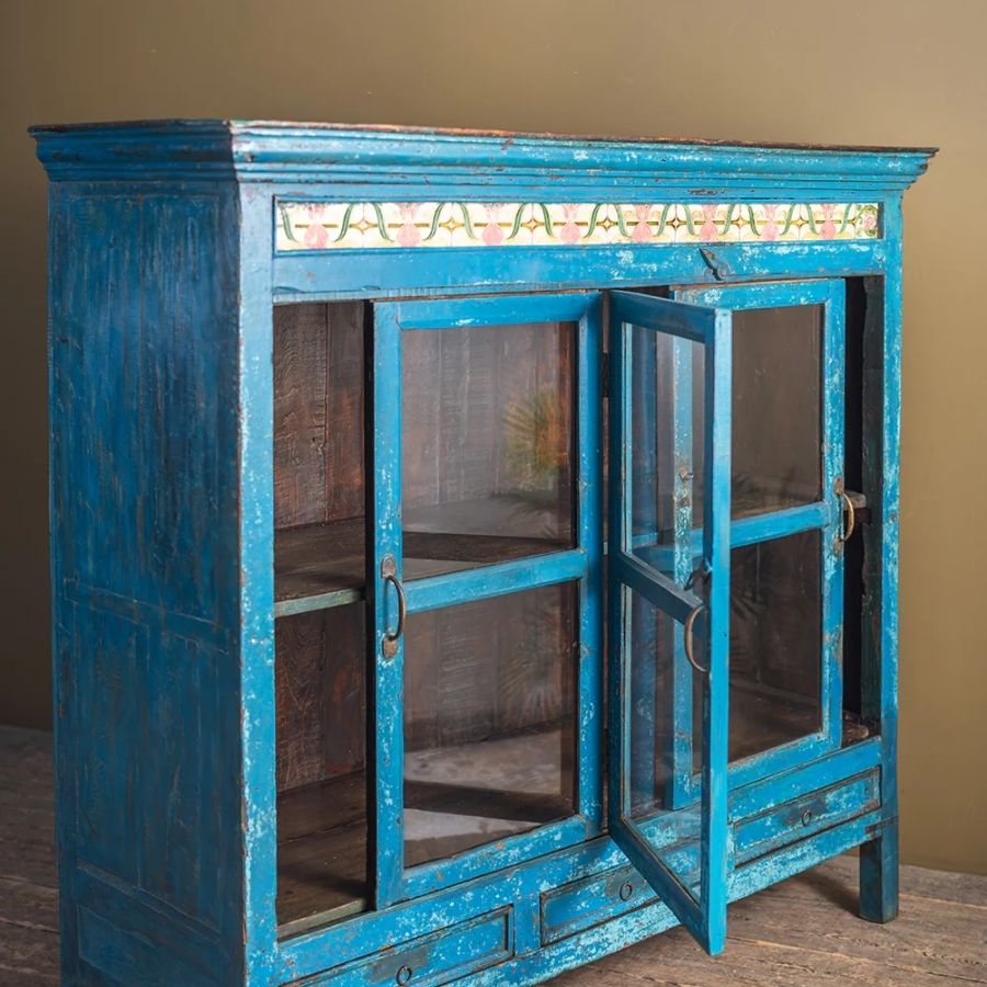 Make a bold and beautiful statement in your home with this Blue Vintage Cabinet with Drawers. Crafted from solid wood, this traditionally styled cabinet features three glazed doors—two sliding and one hinged in the centre—that open onto a spacious shelved interior, making it perfect for both display and organized storage.