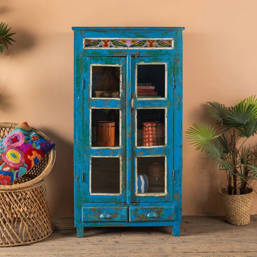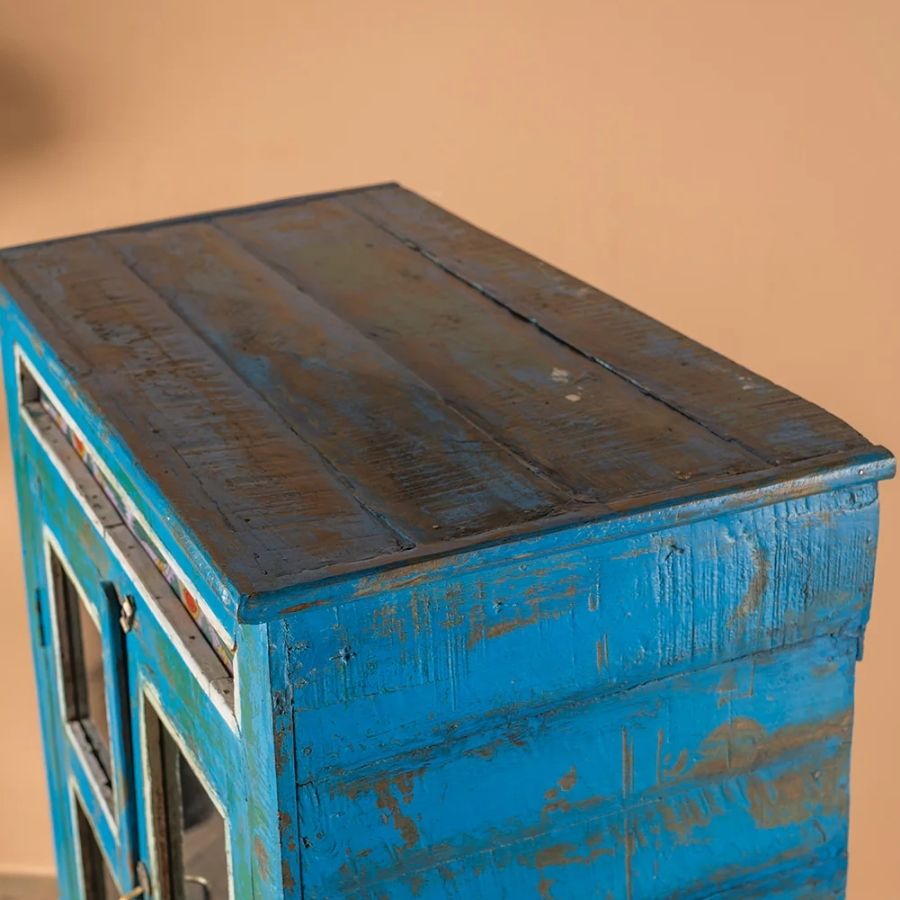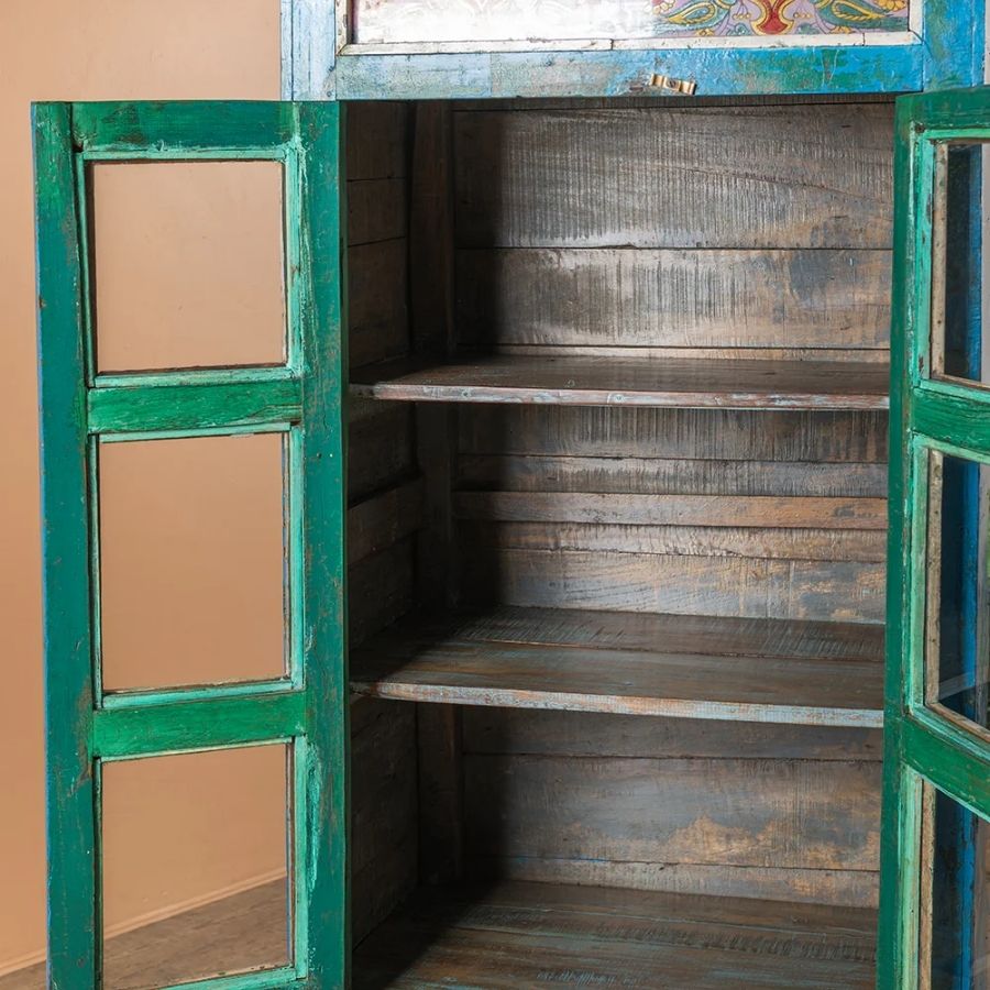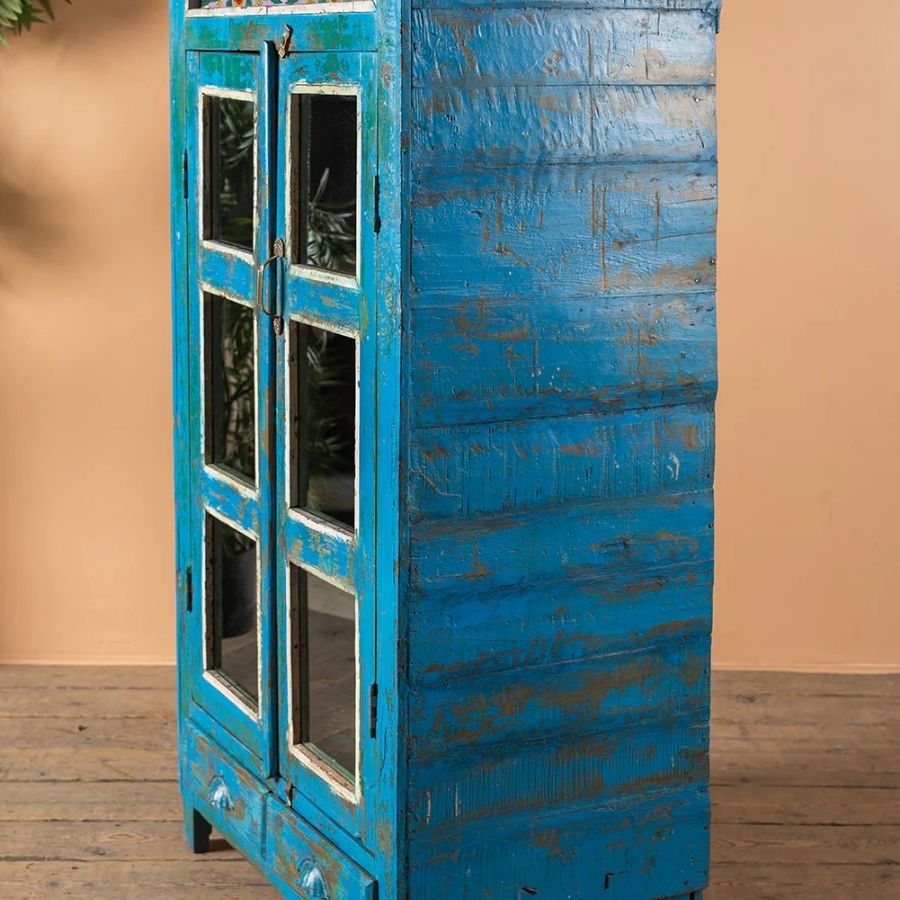 Bring artistic charm and timeless beauty into your home with this Blue Vintage Cabinet with Painted Glass. Crafted from solid wood, this stunning cabinet features two glazed doors that open onto a spacious shelved interior, with two drawers below for added storage.