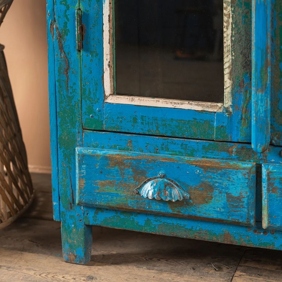 The highly distressed blue finish, with subtle hints of green showing through, creates a rich and textured surface full of character. White highlighting enhances the details, while the hand-painted glass panel at the top adds a unique, decorative touch. Perfect for a living room, hallway, or dining space, this cabinet blends function with striking vintage style.