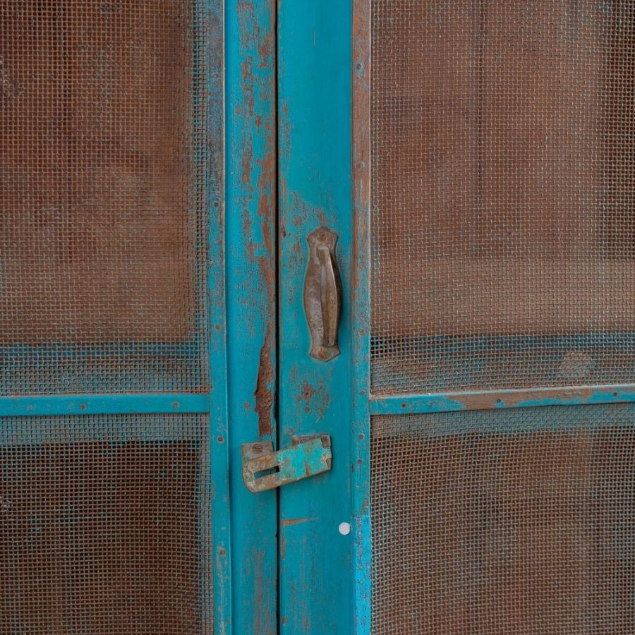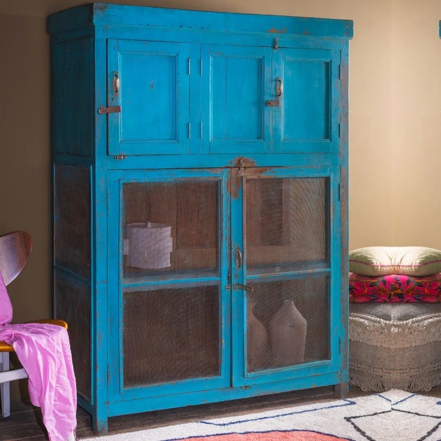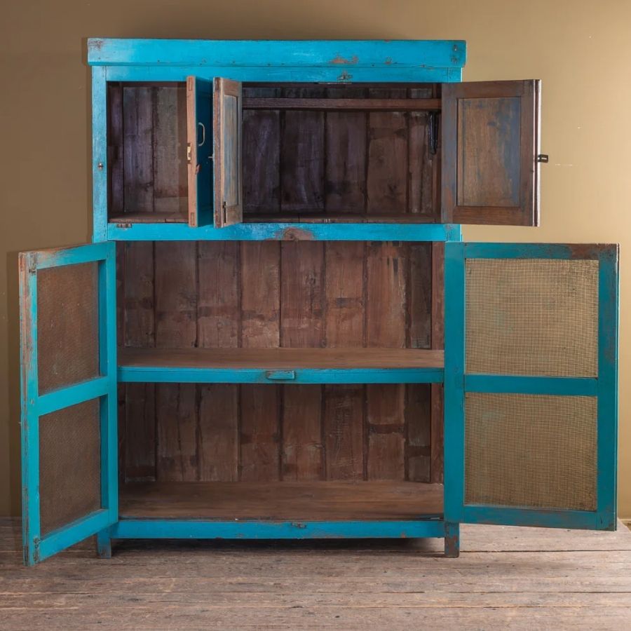 Blue Wooden Vintage Storage Cupboard with Mesh Panels