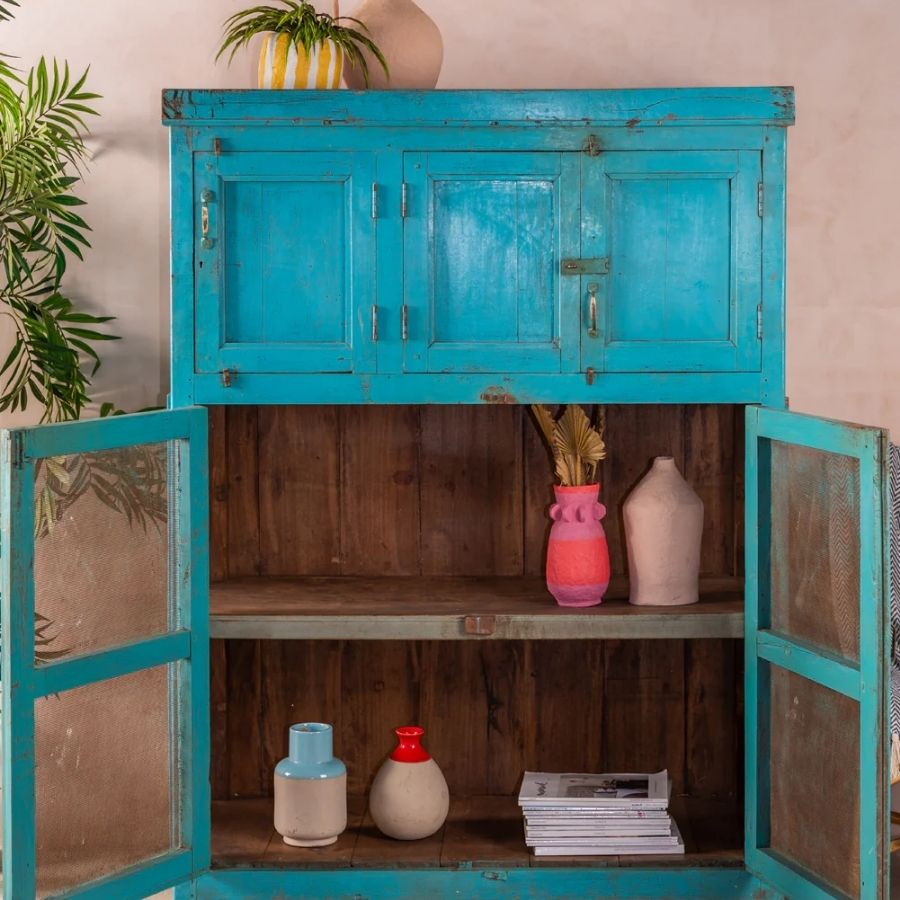 Finished in bright blue distressed paint, the exterior is beautifully contrasted by the warm natural wood interior, giving this piece a bold yet inviting vintage character. With its unique design and ample storage, it will work beautifully in kitchens, dining spaces, or any room that needs characterful storage.