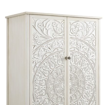 Two glazed front doors open to a natural wood shelved interior, making it perfect for both storage and display. Whether used to showcase decorative items or organize everyday essentials, this cabinet adds warmth, personality, and functionality to any living room, bedroom, or dining area.