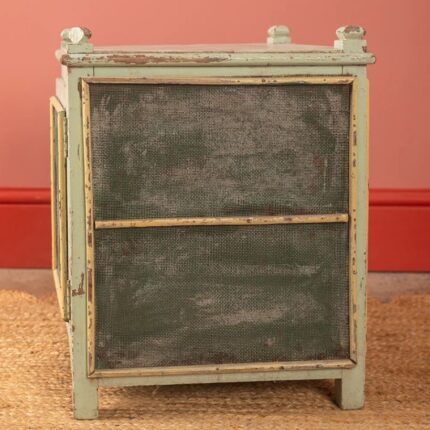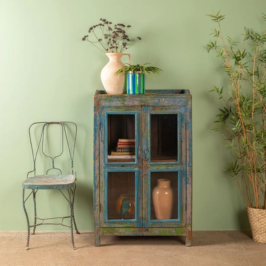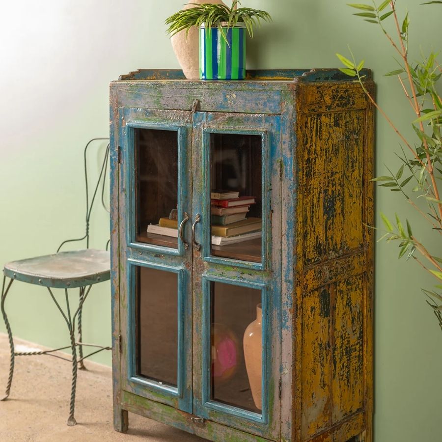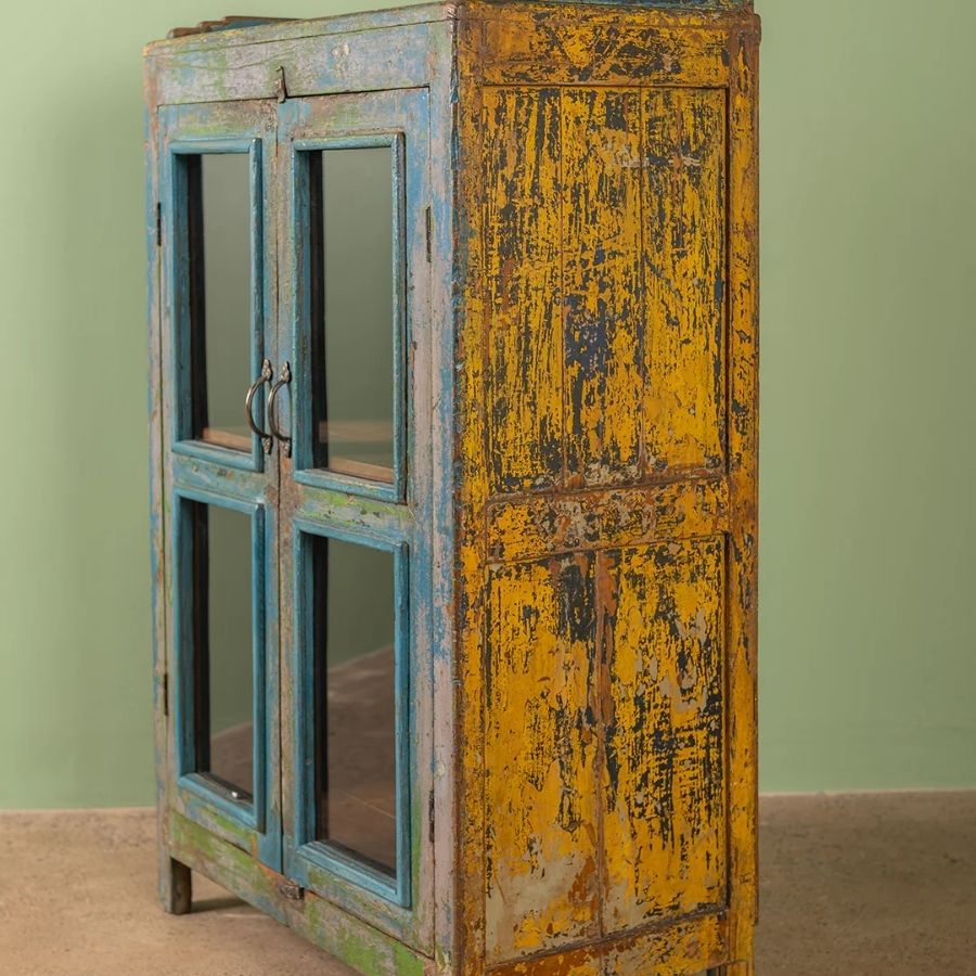 Blue & Yellow Vintage Wooden Cabinet with Glass Doors