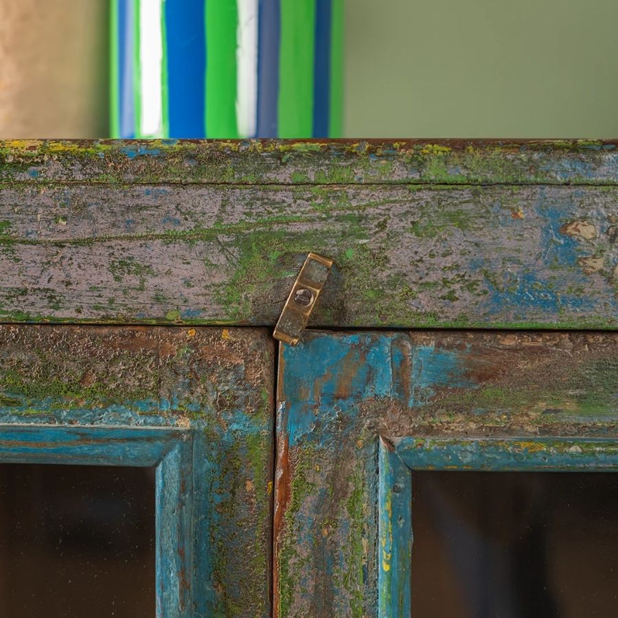 Add bold color and timeless charm to your interior with this Blue & Yellow Vintage Cabinet. Designed with simple yet elegant styling, this wooden cabinet features a beautifully distressed blue exterior enhanced with hints of green and vibrant bursts of yellow, creating a rich, textured surface full of character.