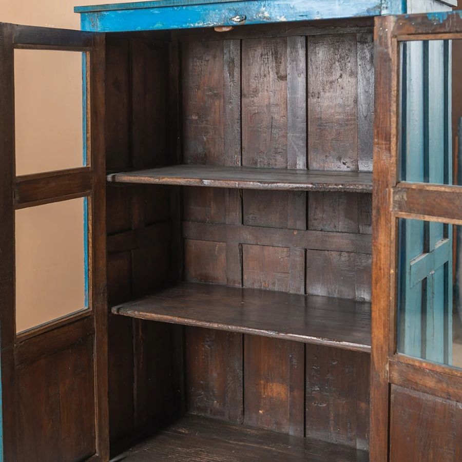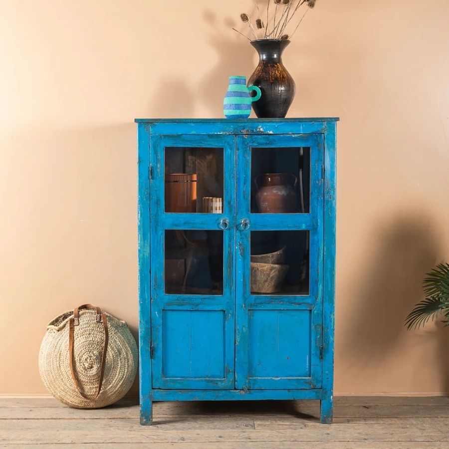Bring bold color and timeless character into your home with this Bright Blue Vintage Cabinet. Crafted from solid wood, this striking cabinet features two-part glazed doors that open onto a spacious shelved interior, making it perfect for both practical storage and elegant display.