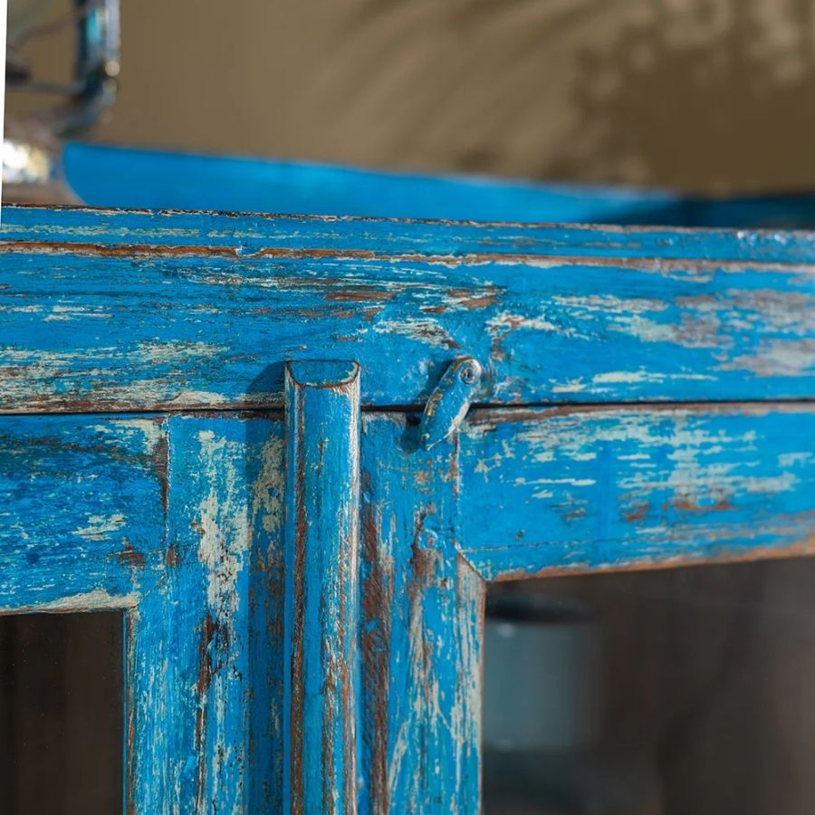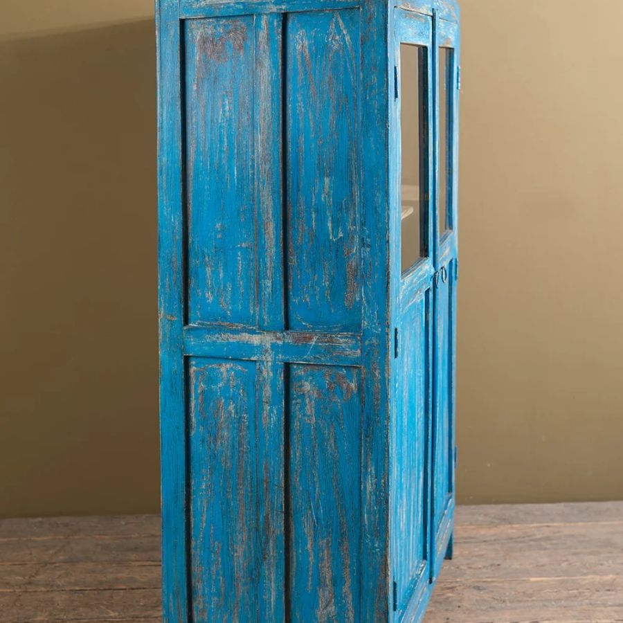 The distressed bright blue exterior creates a striking contrast against the soft off-white interior, giving the piece a unique vintage appeal. Finished with a decorative edged top, it also offers extra space to display decorative accessories, plants, or artwork. This cupboard is a perfect way to brighten any room while keeping your space organized.