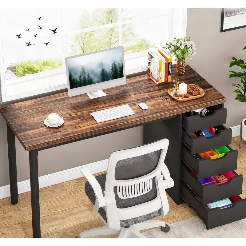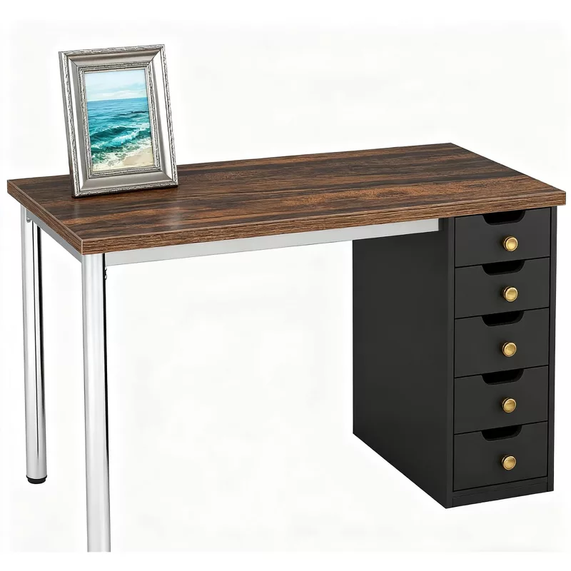 This brown and black computer desk is designed to provide both style and practical storage for small home offices and bedrooms. Built with a sturdy wooden frame and a smooth wooden desktop, it offers durability and a comfortable work surface for laptops, writing, and daily tasks. The five spacious drawers provide ample storage for office supplies, documents, and personal items, helping you keep your workspace clean and organized.
