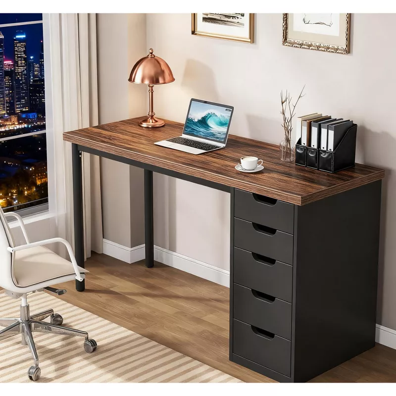 Brown & Black Computer Desk with 5 Drawers – Small Space Home Office Desk