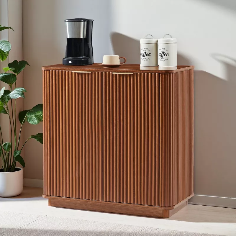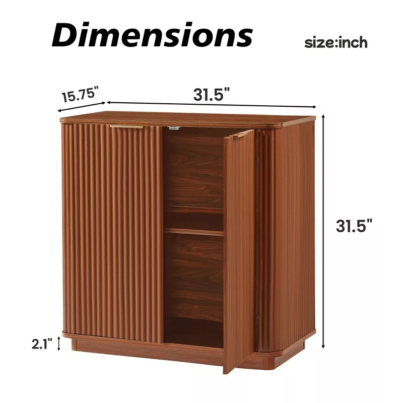 This buffet sideboard cabinet features a unique curved wave design that adds a modern and artistic touch to your home. Finished in a warm oak tone, it blends beautifully with a variety of interior styles. Built with a sturdy particle board frame and an MDF surface, this cabinet offers reliable durability along with a smooth, elegant finish. The adjustable interior shelf and double-door design provide flexible storage for dinnerware, décor, or everyday essentials, making it ideal for dining rooms, living rooms, or entryways.