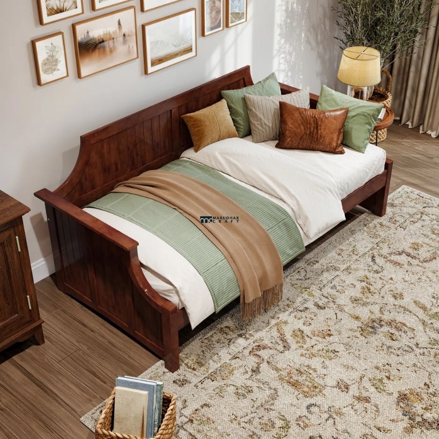Add warmth and timeless elegance to your living or guest space with this Classic Solid Wood Daybed. Designed with a gently curved panel backrest and sturdy side arms, this daybed offers both comfort and refined craftsmanship. The rich walnut finish highlights the natural wood grain, making it a perfect blend of traditional charm and everyday functionality.