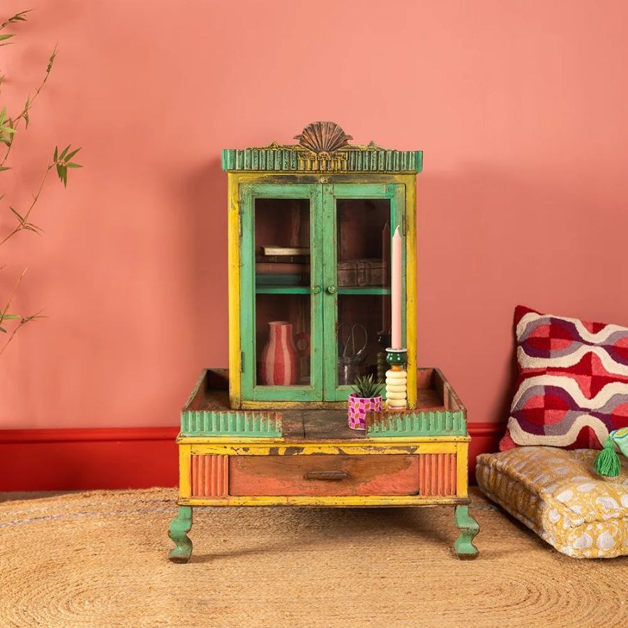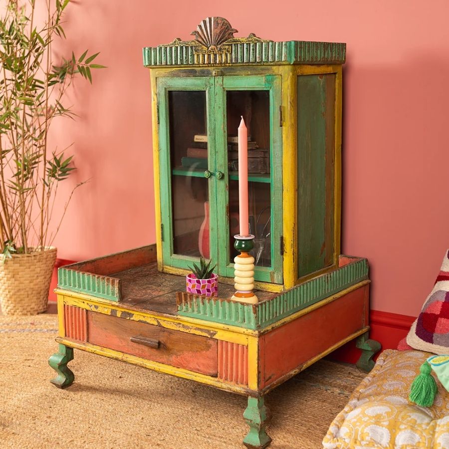 Colourful Vintage Temple Cabinet with Drawer & Glass Doors