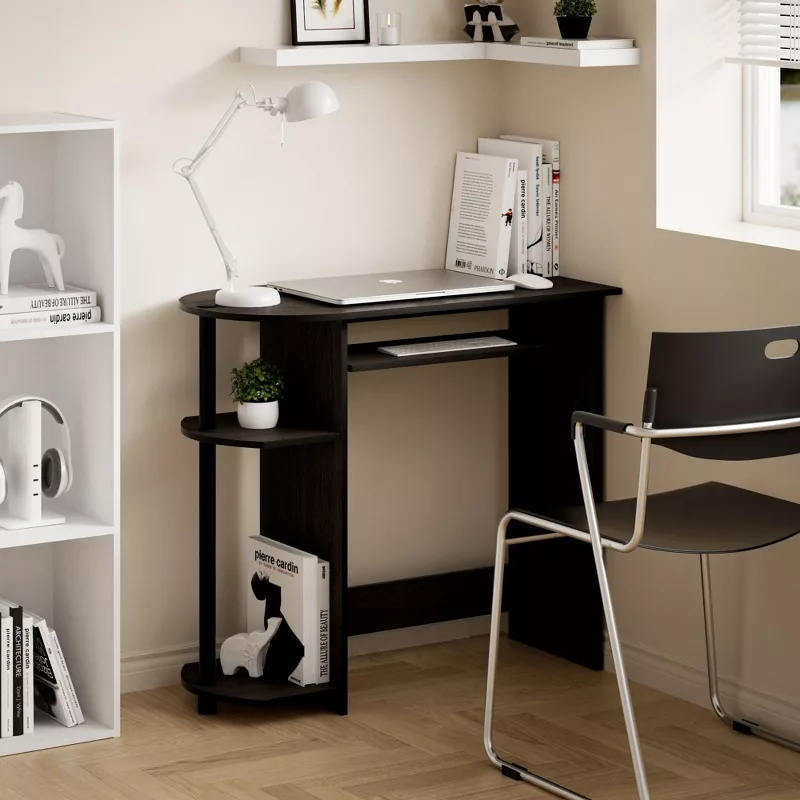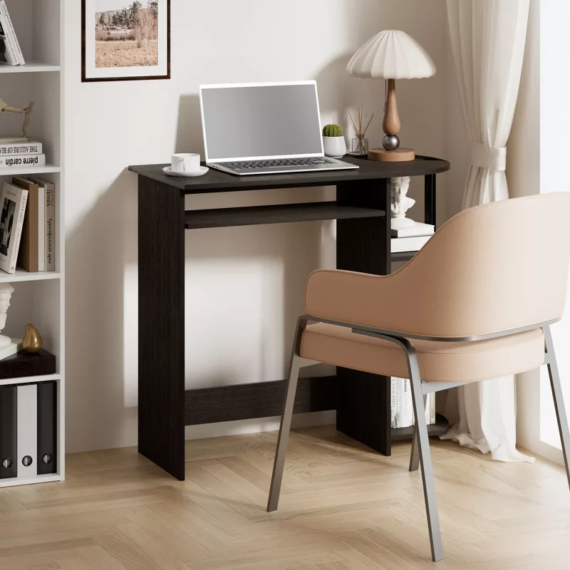 This compact computer desk is designed to provide a comfortable and efficient workspace for writing, studying, or using a laptop. Made with a sturdy wooden frame and a smooth wooden surface, it offers durability and stability for everyday use. The built-in keyboard tray helps keep your desktop organized, while the two open storage compartments provide easy access to books, documents, and office essentials. Its space-saving design makes it ideal for bedrooms, dorm rooms, and home offices.
