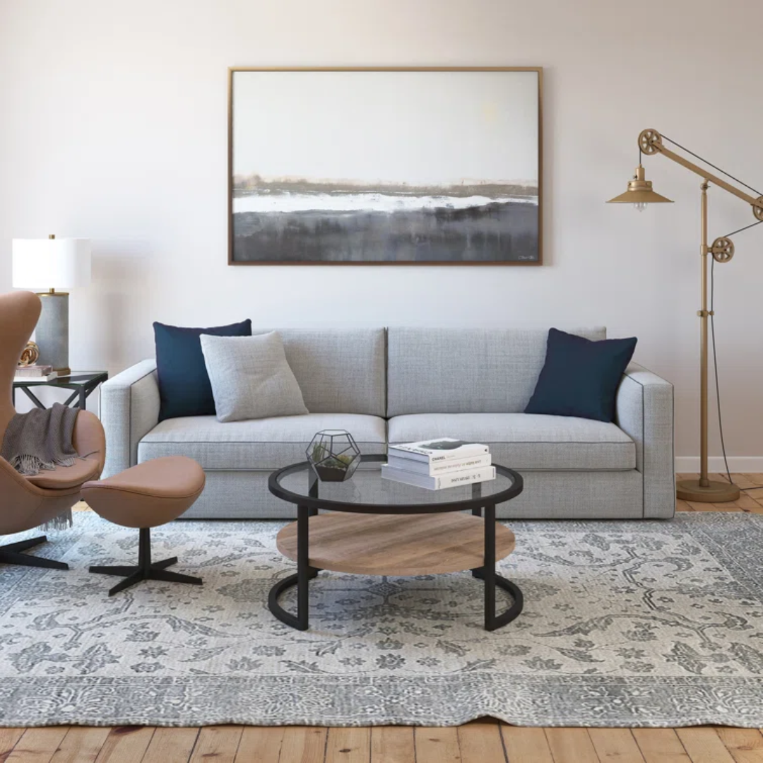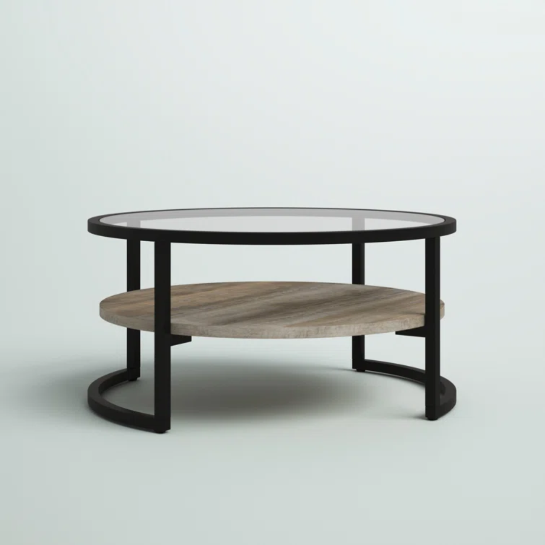 We love the mixed material look of this round coffee table that borrows from modern and industrial design sensibilities. The open, geometric frame is made from brushed stainless steel with a dark antiqued finish. It supports a lower wooden shelf with a light stain that highlights the natural grain variation and is ideal for your collection of coffee table books or a stack of magazines. The tempered glass top is large enough for several people to dine while watching a good movie or the big game. Wipe clean with a soft dry cloth. Assembly is required, but the good news is all tools are included.