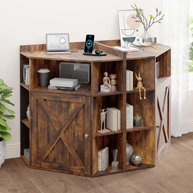 Corner Storage Shelf with USB Charging Station – 6-Cubby Wooden Bookshelf with Doors