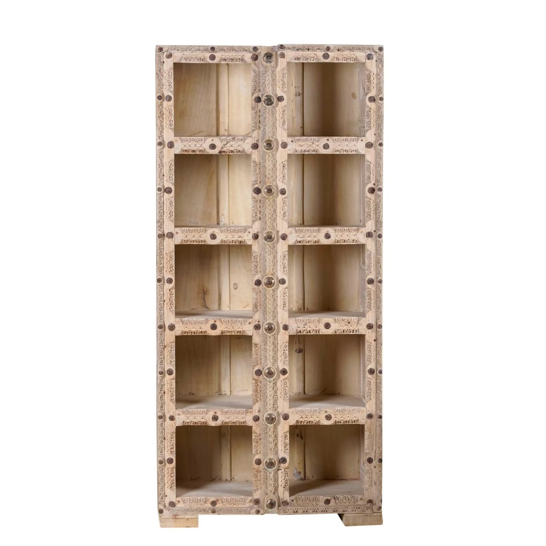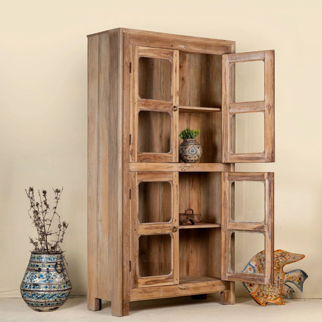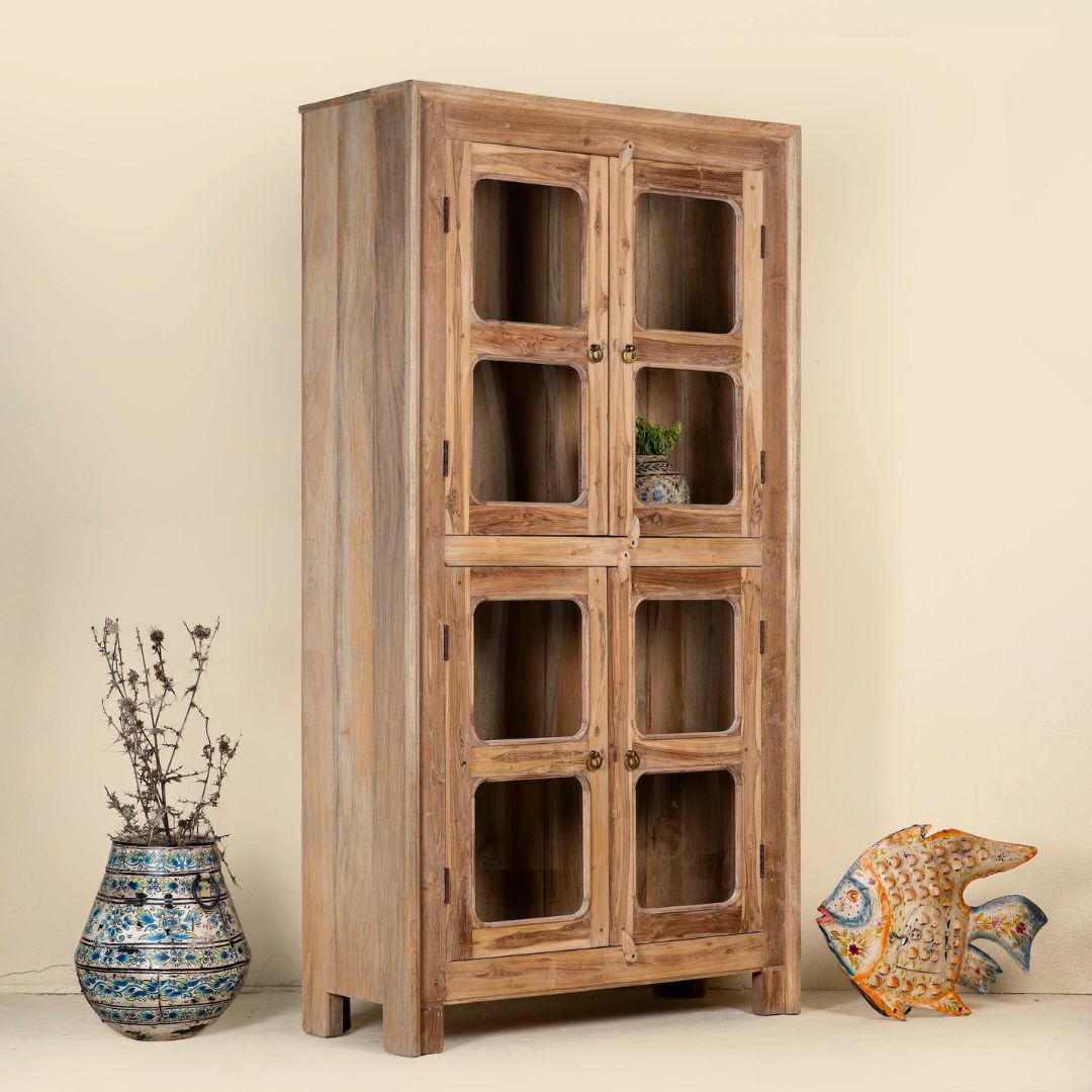 Chander is a refined example of teak wood furniture that blends rustic elegance with understated coastal flair. Crafted from reclaimed wood, this tall vitrine features front panels made from old door frames—each with softly weathered edges and gently rounded contours. The clean lines and airy glass panels evoke an effortless Ibiza-inspired aesthetic.