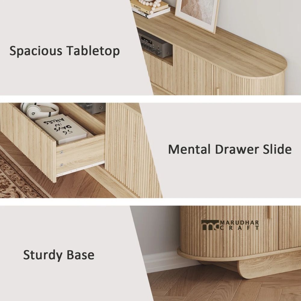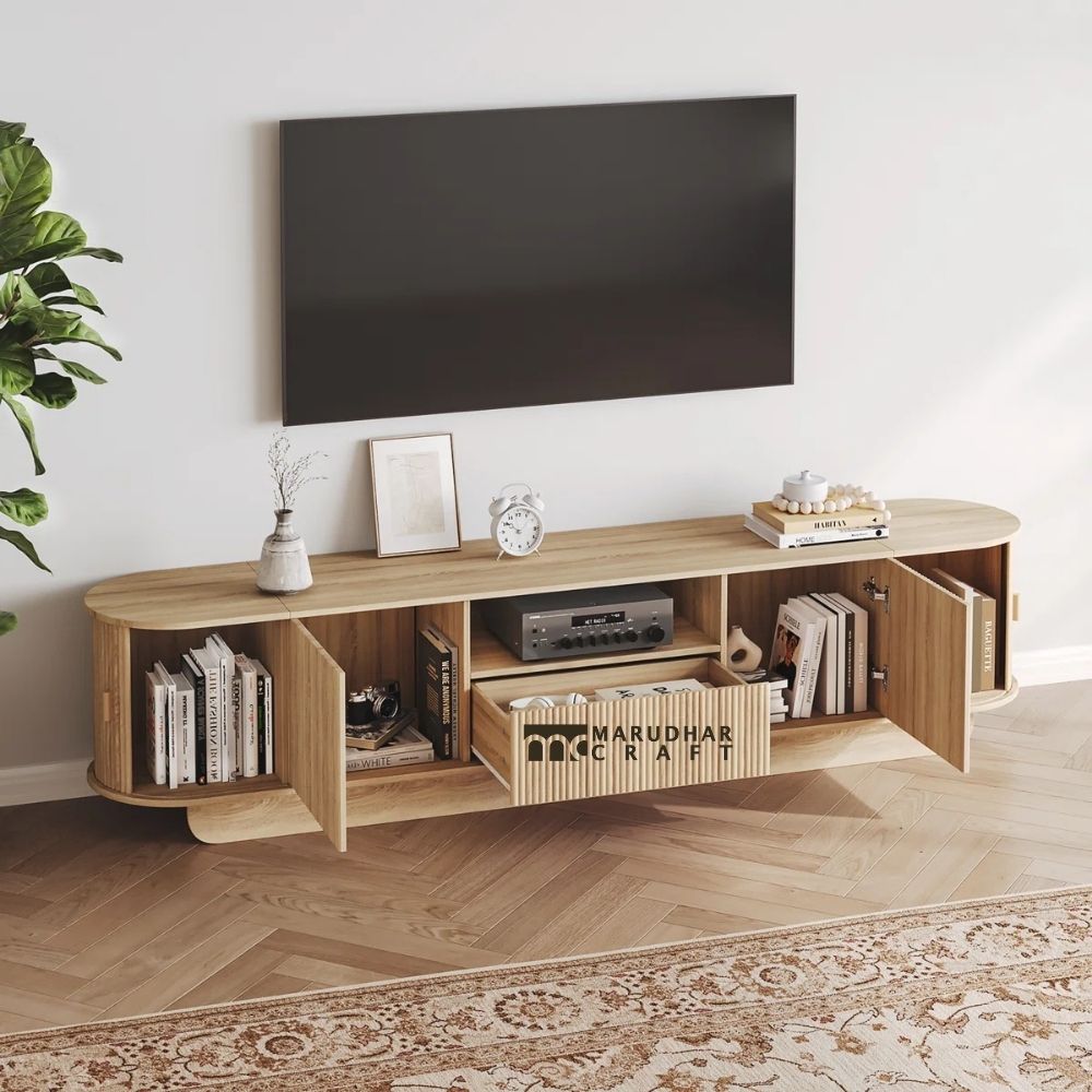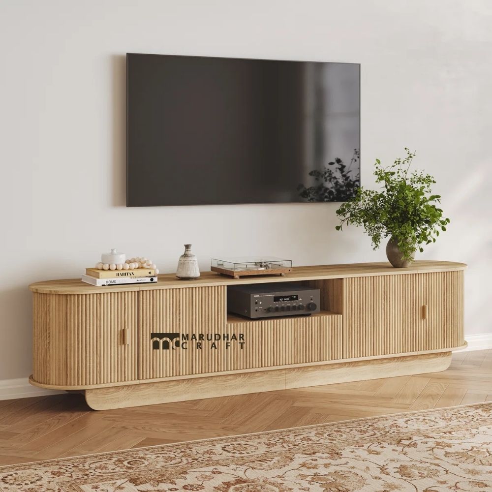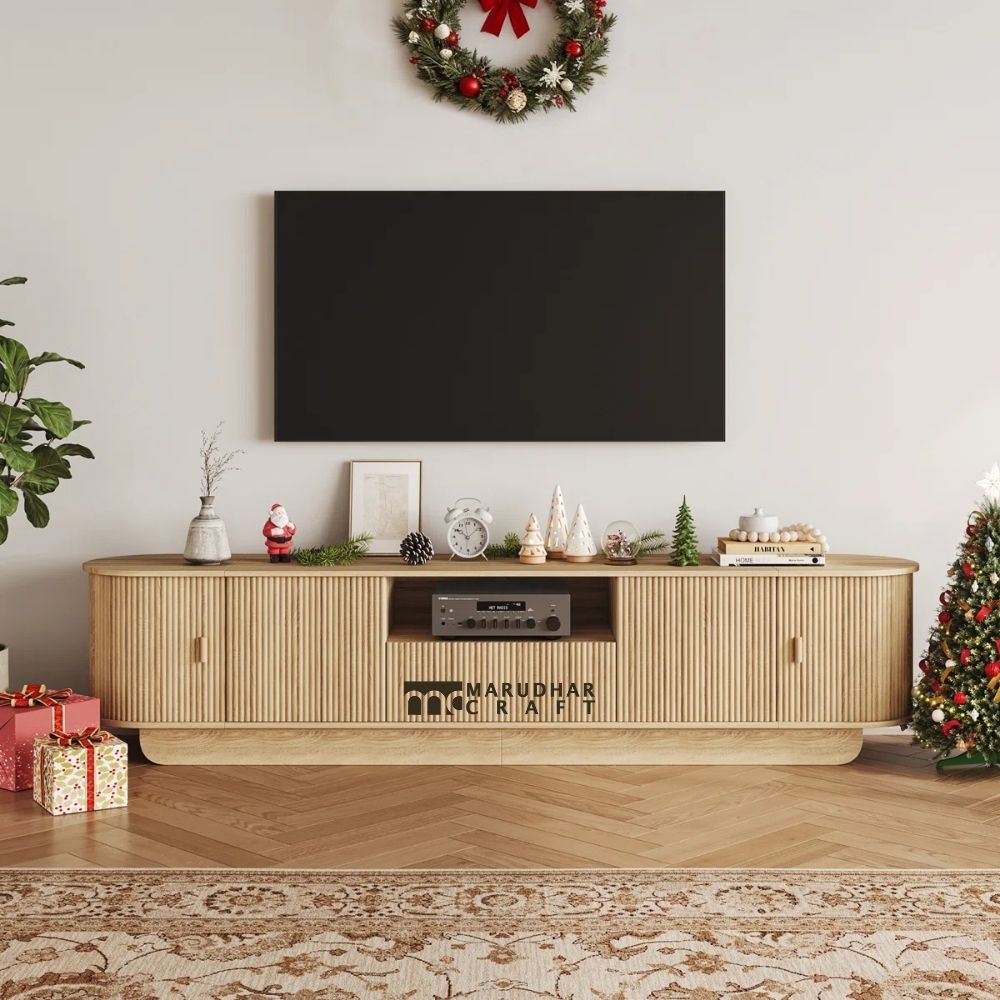 Enhance your living room with this curved TV stand, designed to bring softness and modern elegance to Indian interiors. The gently rounded edges create a refined look while also offering added safety for family homes. Its balanced structure provides a stable surface for your television and space to organise media essentials neatly.