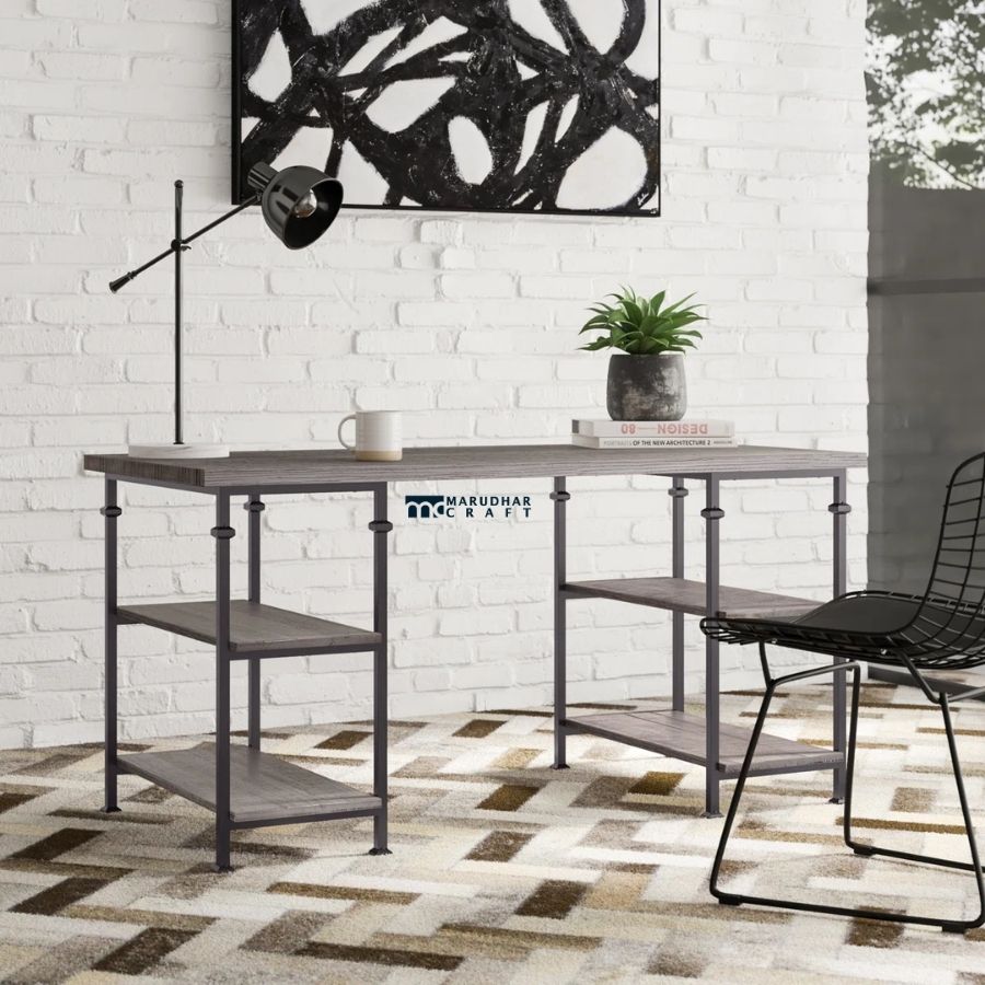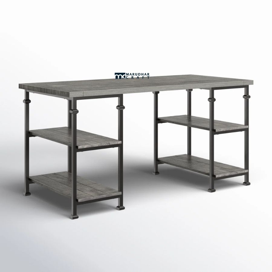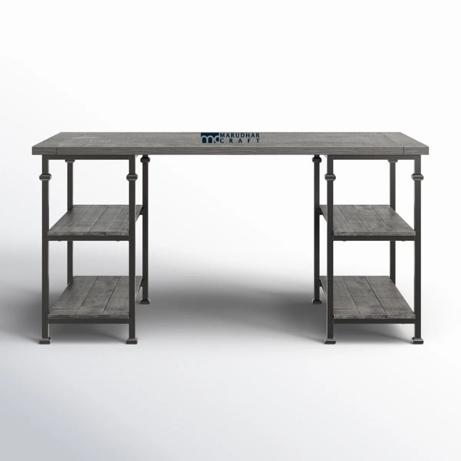 This dark wood and metal study table features a bold industrial design combined with practical storage. The spacious tabletop provides ample room for work, décor, or a desktop setup, while the open side shelves offer convenient storage for books and essentials. Supported by a strong metal frame, this desk is ideal for home offices, study rooms, or creative spaces where durability and style are equally important.