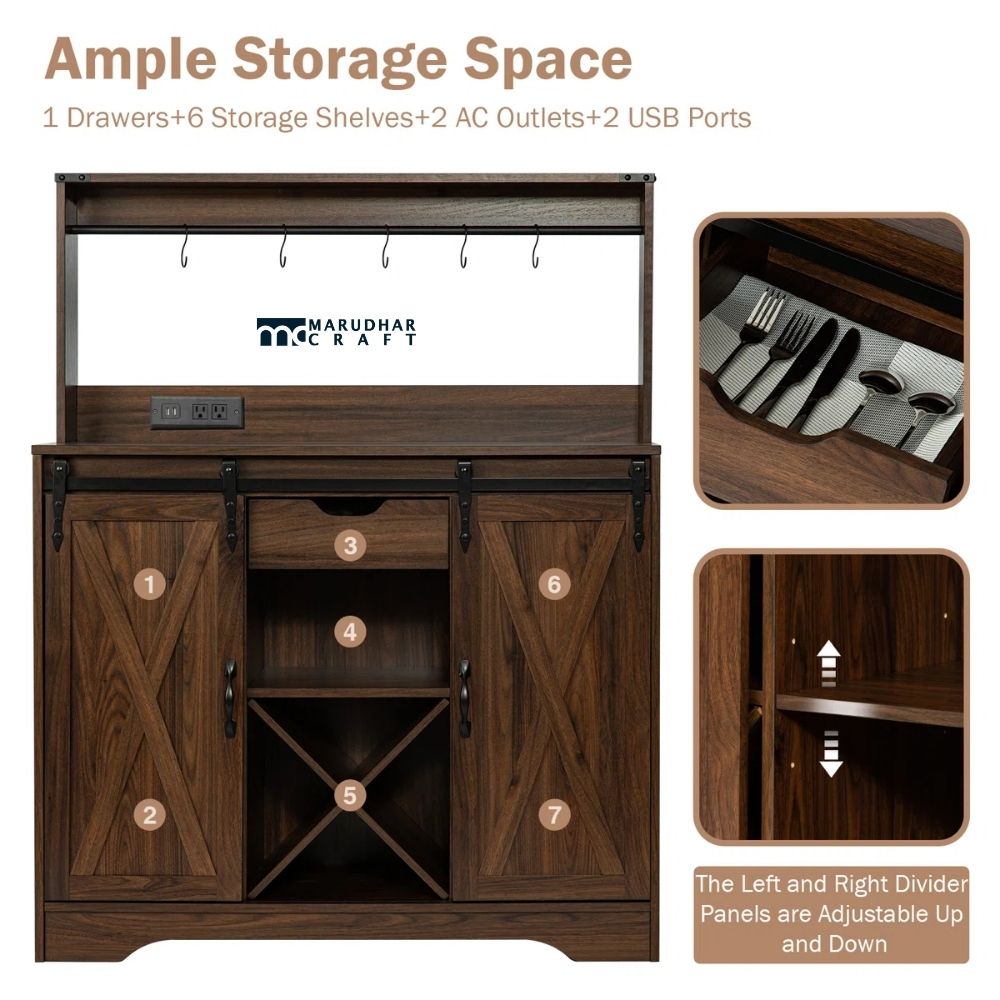 The spacious tabletop is ideal for coffee machines, serveware, or décor items, while the internal shelves and compartments help keep essentials organized. Its classic farmhouse look blends beautifully with both modern and traditional homes. Practical, durable, and visually appealing, this cabinet is a versatile addition to dining rooms, kitchens, or living spaces.