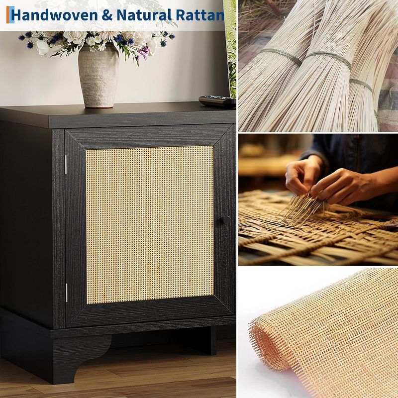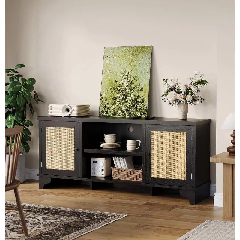 Add warmth and farmhouse charm to your living space with this stylish TV stand featuring decorative rattan doors. Designed to support televisions up to 65 inches, this media console combines rustic appeal with modern functionality. The sturdy wood composite frame and smooth MDF surface provide reliable support, while the enclosed storage helps keep media devices and accessories neatly organized. Its balanced design makes it a perfect fit for farmhouse, coastal, or contemporary interiors.