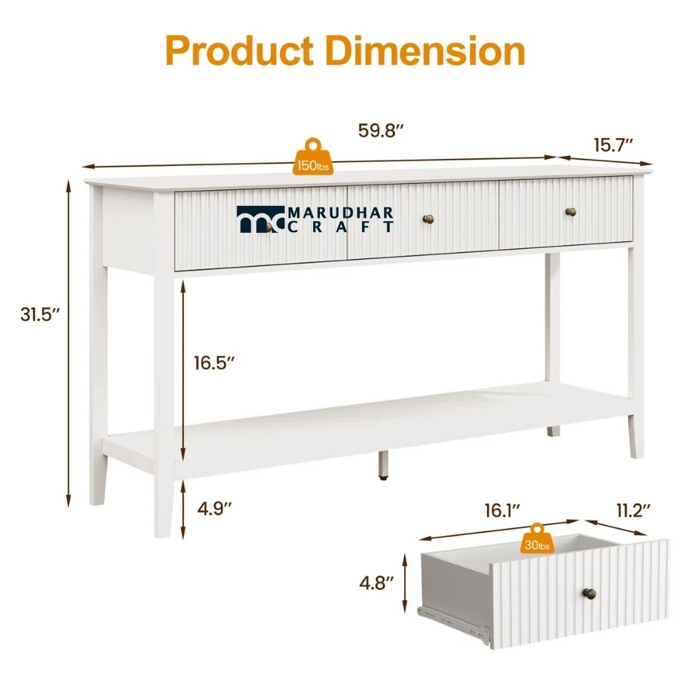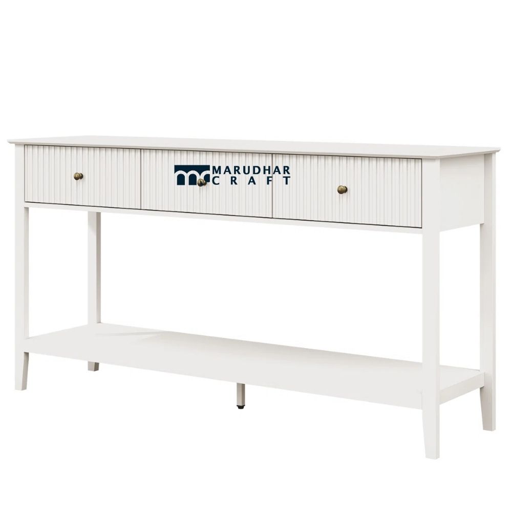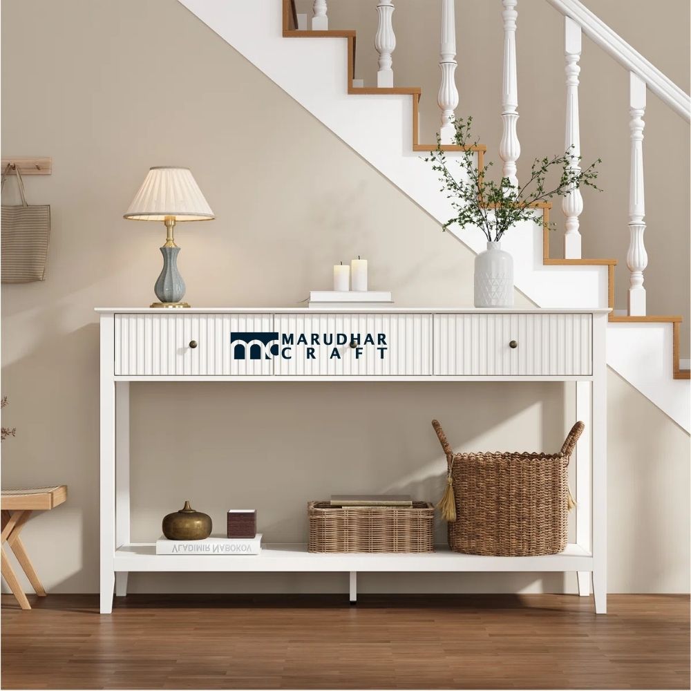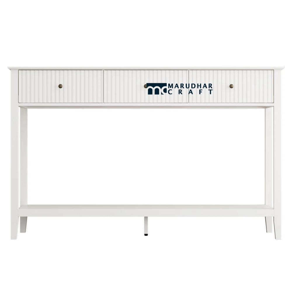 This fluted console table with three drawers is designed to bring refined style and practical storage to Indian homes. The beautifully fluted detailing adds depth and texture, creating a sophisticated look that elevates any entryway or living space. Crafted with a sturdy structure, it features three smooth drawers that provide ample space for organizing daily essentials. Ideal for entryways, living rooms, or hallways, this console table blends modern design with timeless elegance.