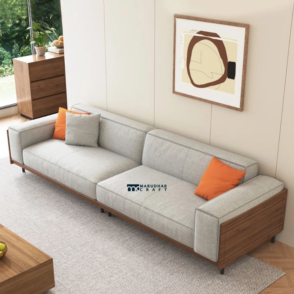 Designed for comfortable family seating, this four-seater sofa is crafted with a strong solid wood structure and finished in breathable cotton-linen fabric, ideal for Indian homes. The natural fabric feels soft and comfortable in all seasons, while the sturdy wooden frame ensures durability for daily use. Comes with matching throw pillows that enhance comfort and add a refined look. Perfect for large living rooms, this sofa creates a warm and inviting seating space for guests and family gatherings.