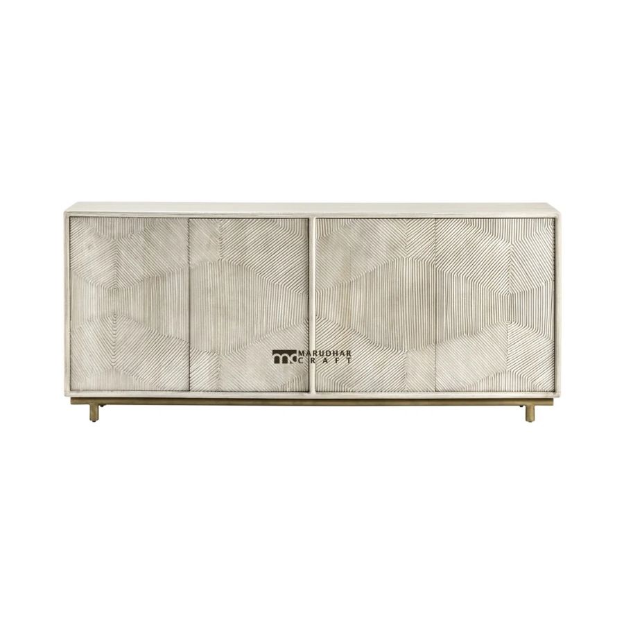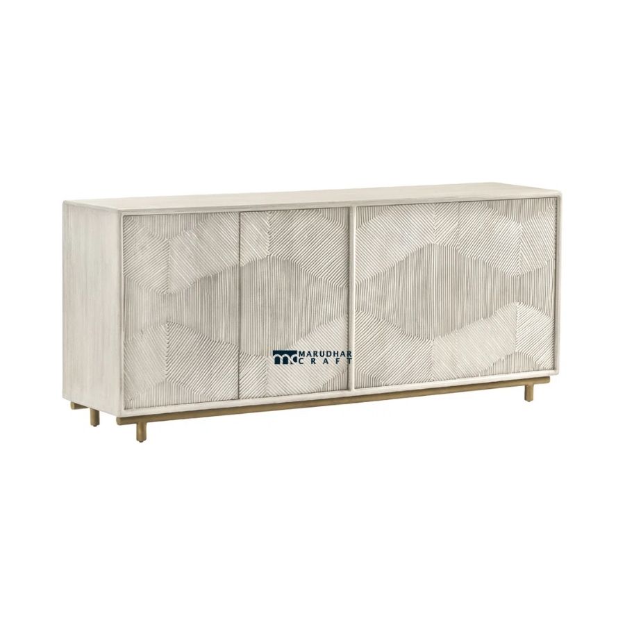 This geometric textured sideboard is a refined blend of modern design and artisanal craftsmanship. Featuring intricately carved door panels with a subtle geometric pattern, it adds depth, character, and a sculptural presence to any interior.