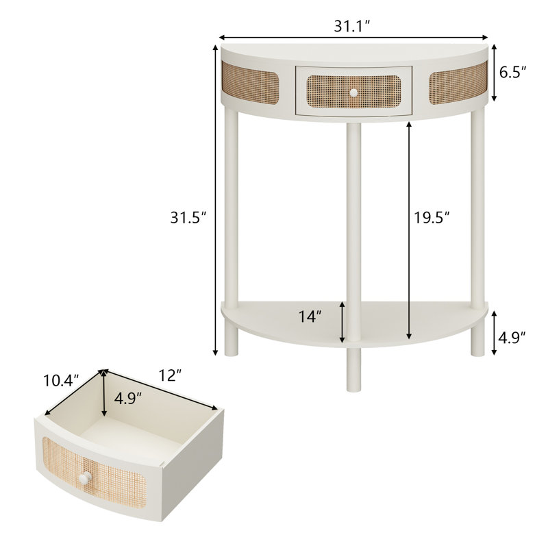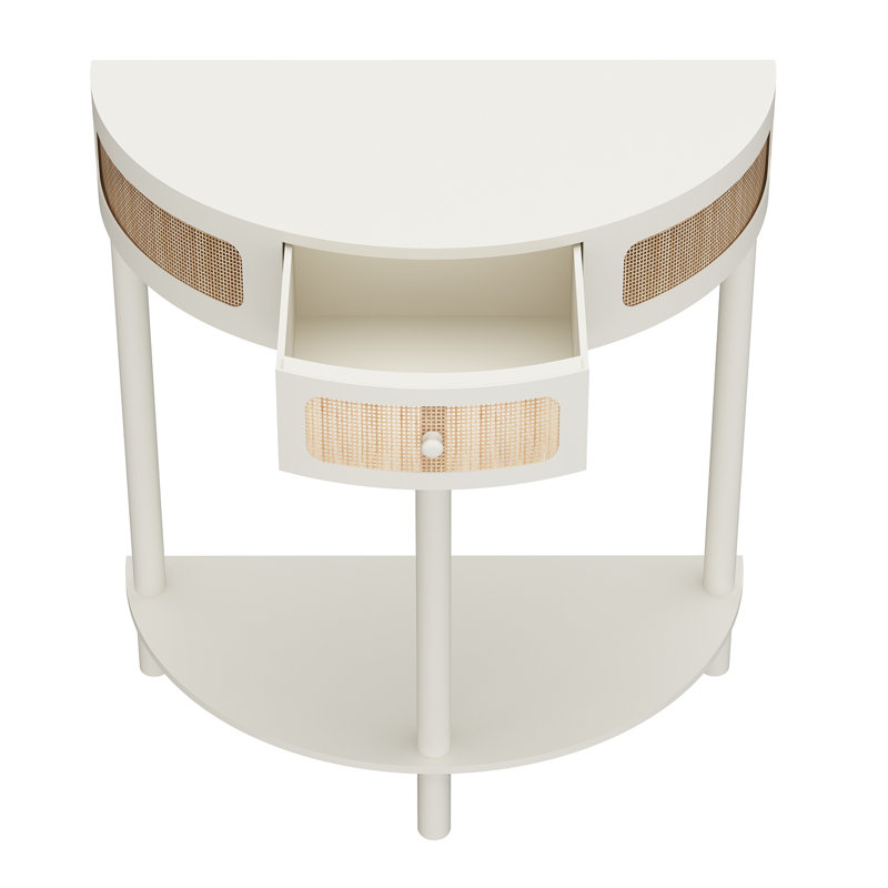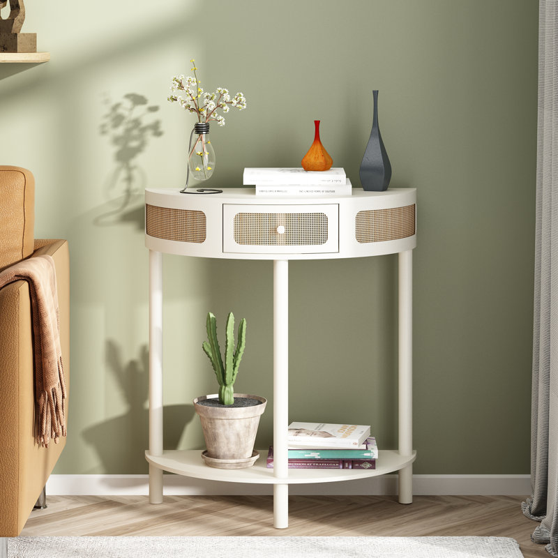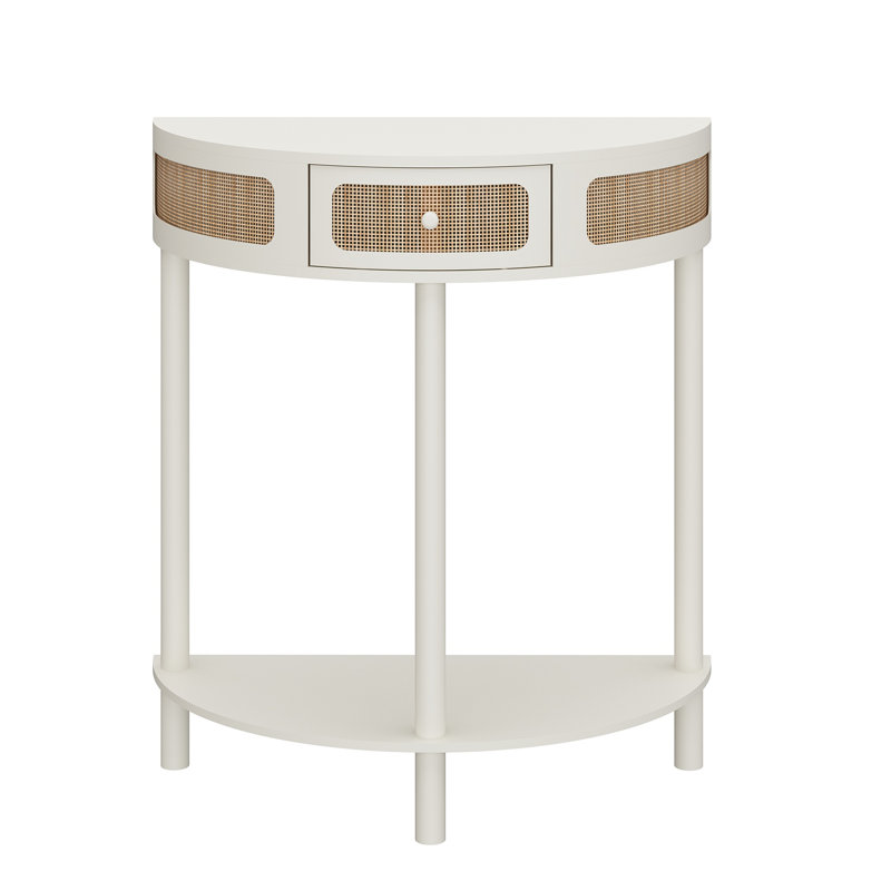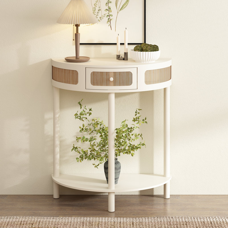 Half-Round Solid Wood Console Table with Authentic Rattan Detailing for Entryway and Living Room