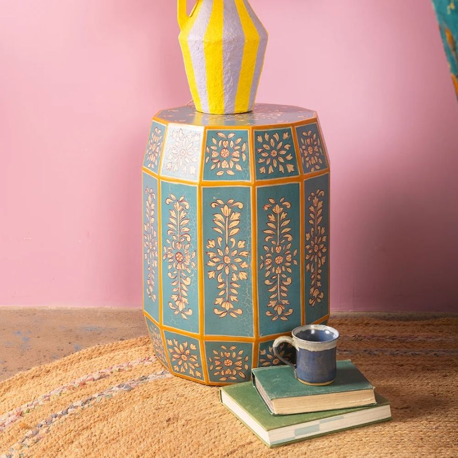 Designed for versatility, this piece works effortlessly as a side table or can double as a stool to provide extra seating when needed. Its compact form and artistic detailing make it a perfect accent for living rooms, bedrooms, or creative spaces. Pair it with its navy blue equivalent to create a coordinated and visually appealing setting.