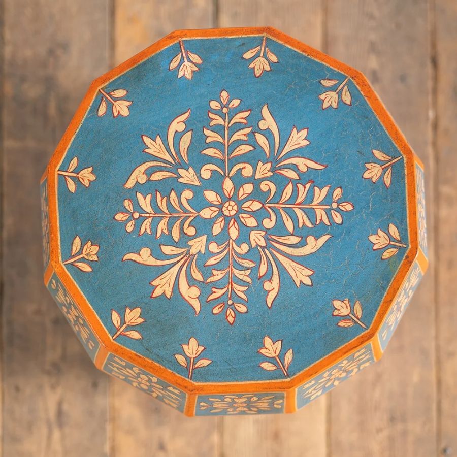 The Hand Painted Sky Blue Side Table is a charming blend of artistry and functionality. Beautifully finished in a soft sky blue tone, this handcrafted piece features elegant floral motifs complemented by striking orange edging, creating a lively yet refined look.