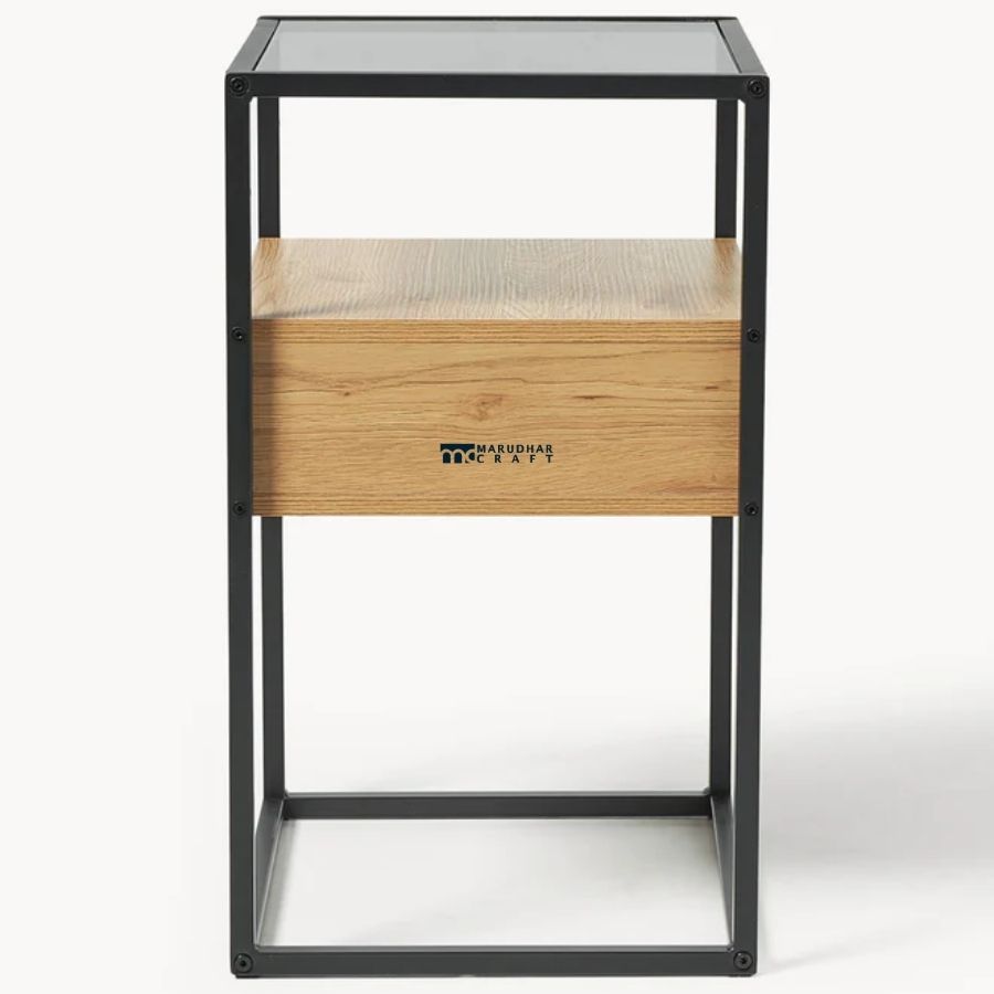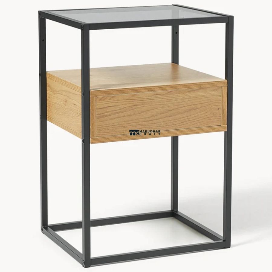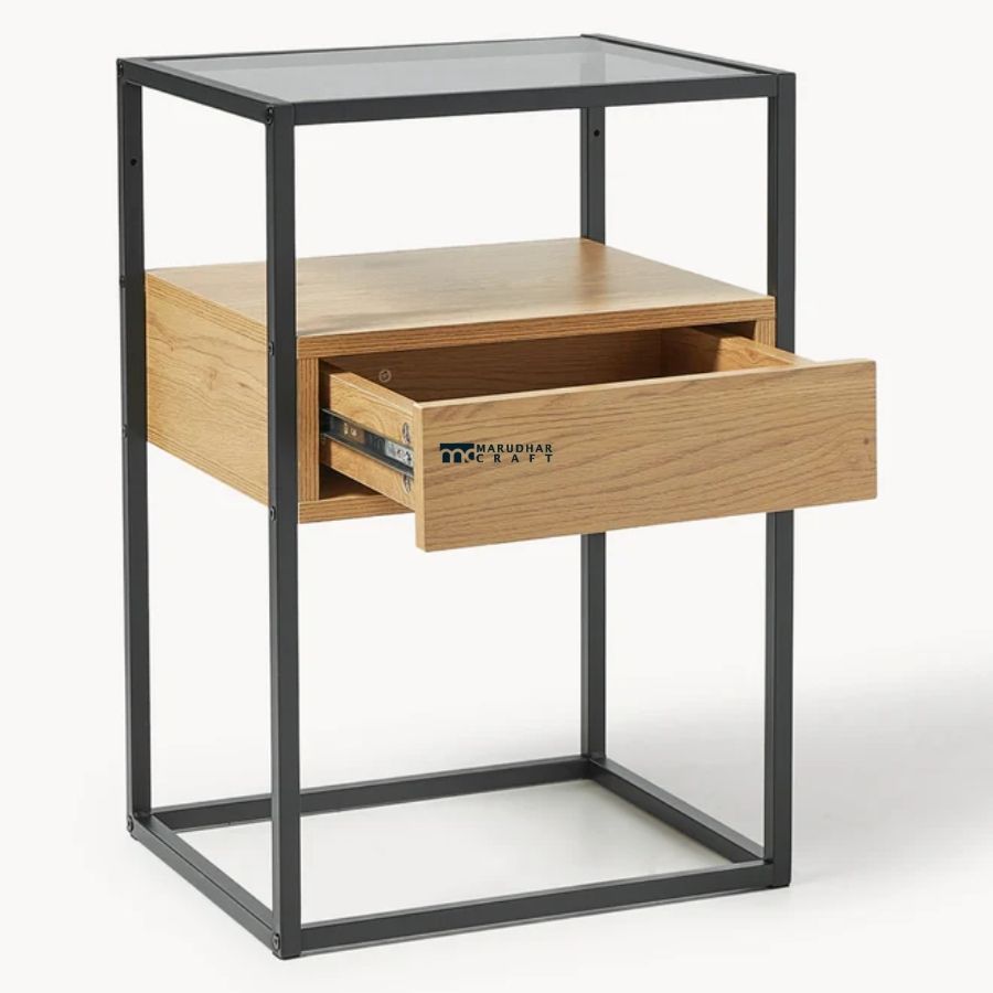 Industrial Bedside Table with Glass Top and Floating Wooden Drawer