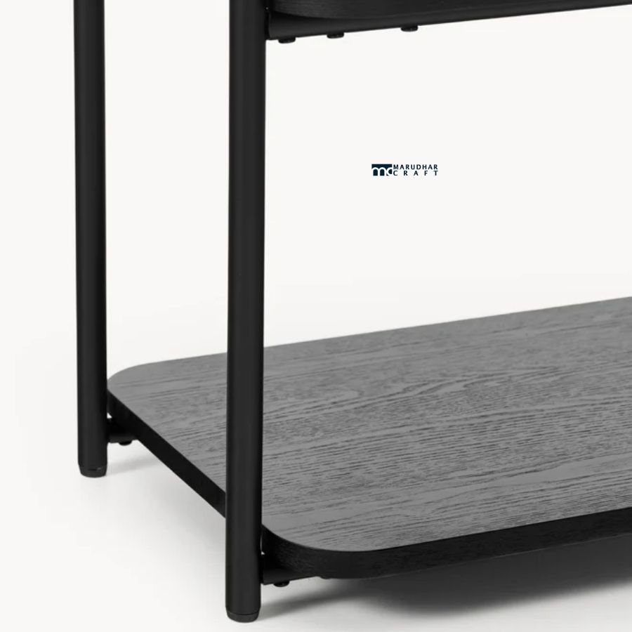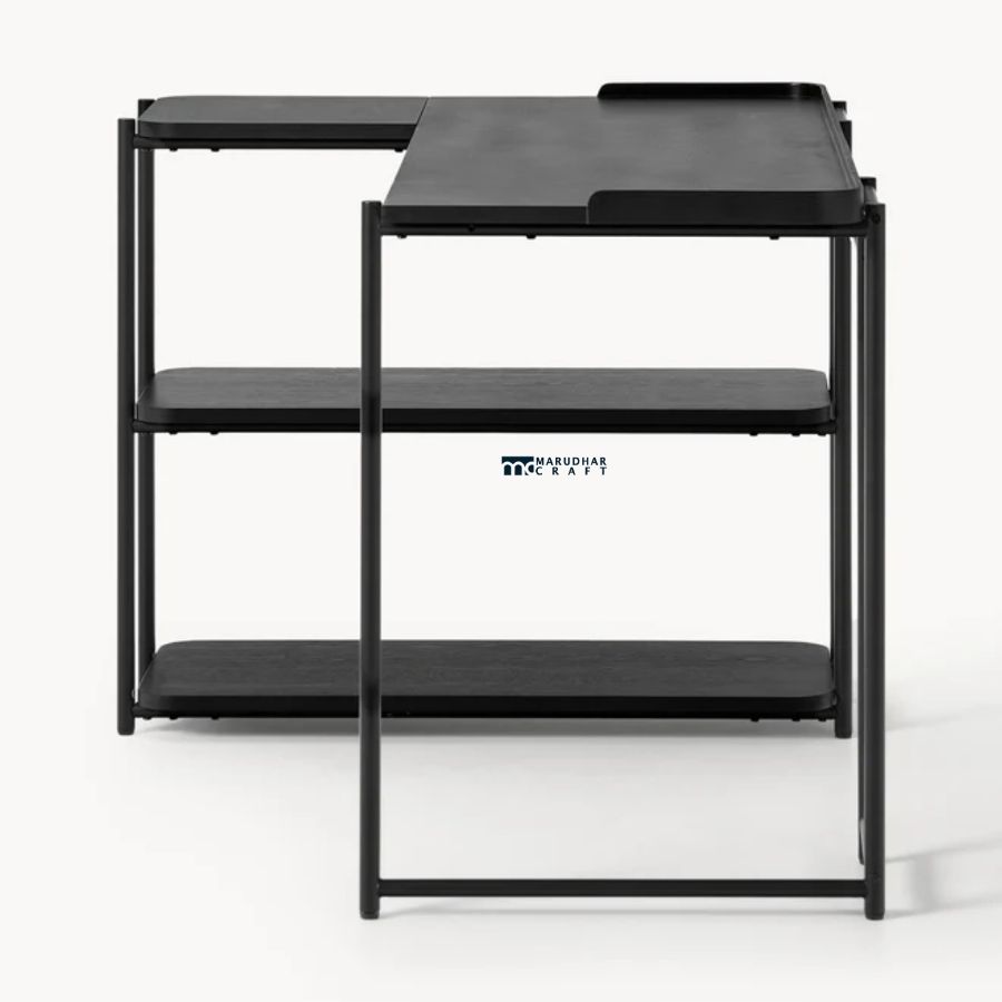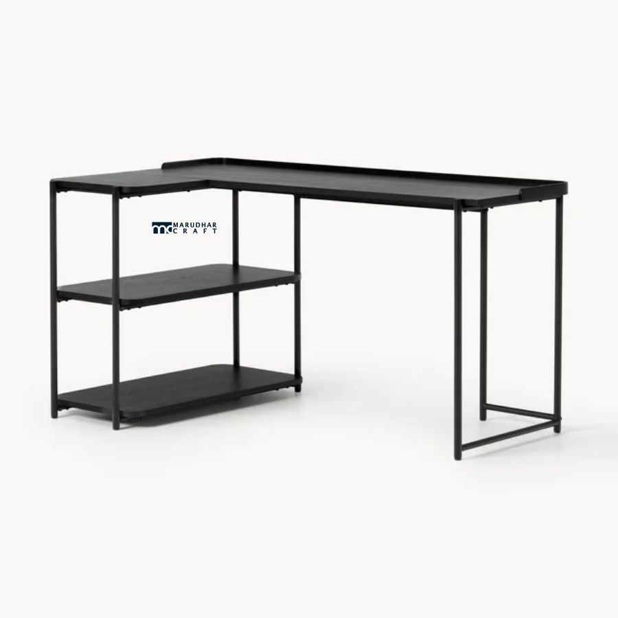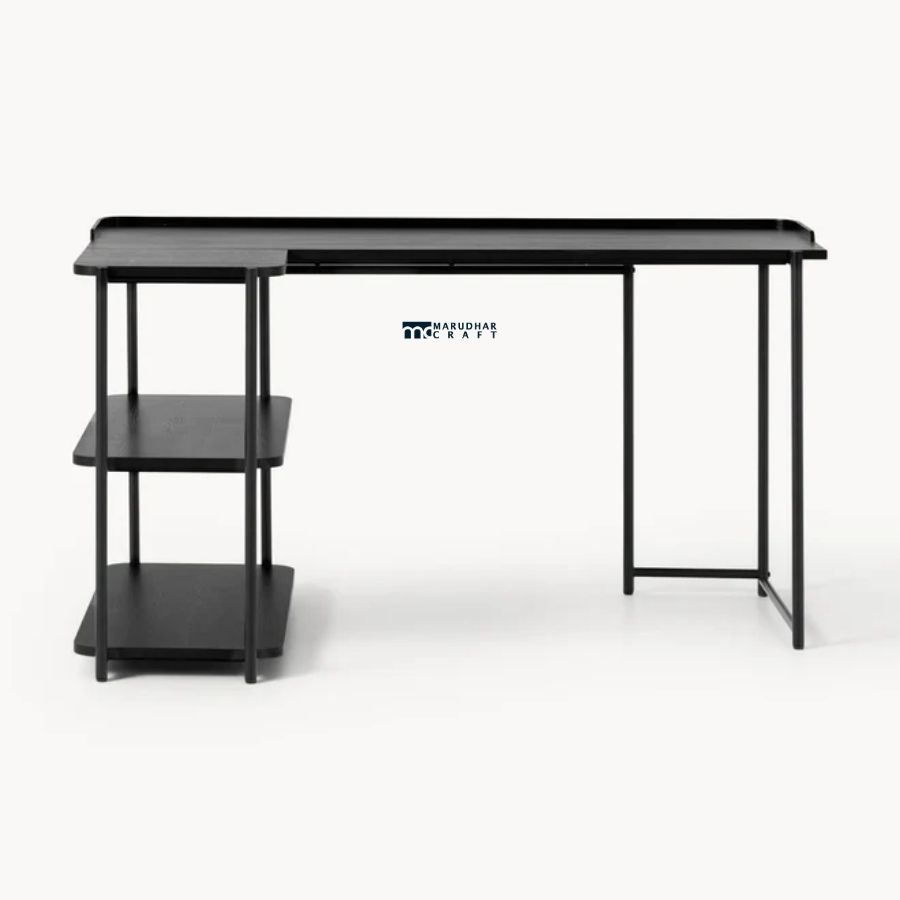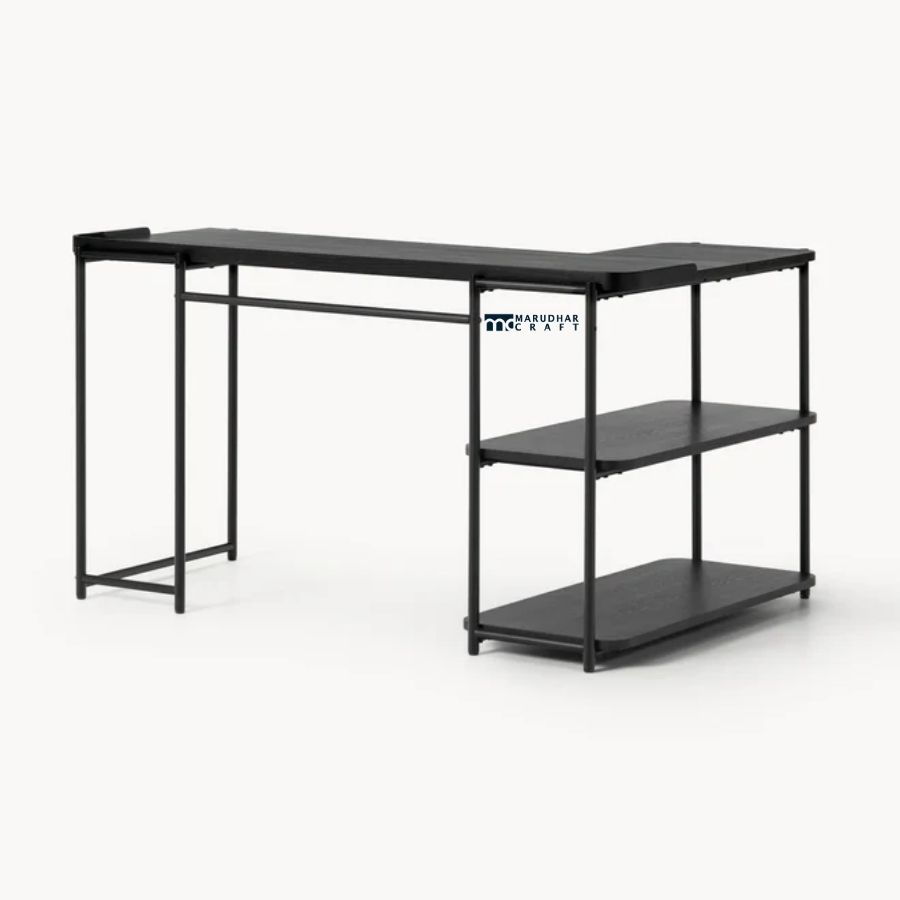 A compact industrial-style study desk featuring a sleek metal frame and a durable tabletop, complemented by an integrated side storage unit. Designed for modern living spaces, it offers a practical workspace with added organization for home offices and study areas.