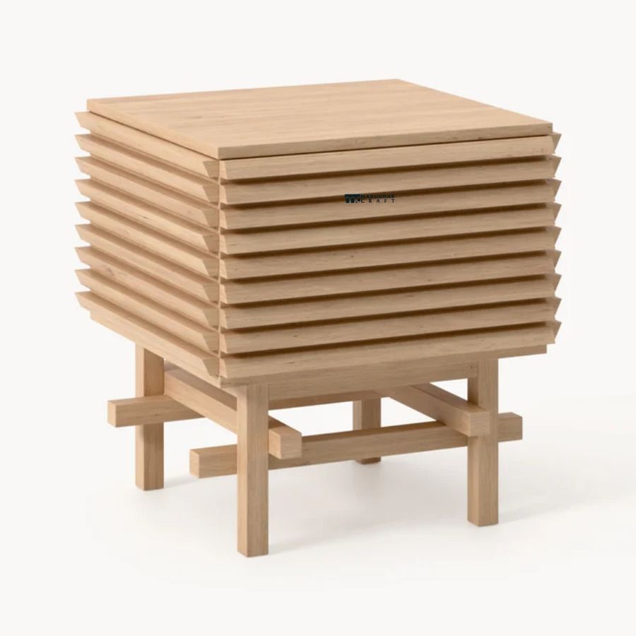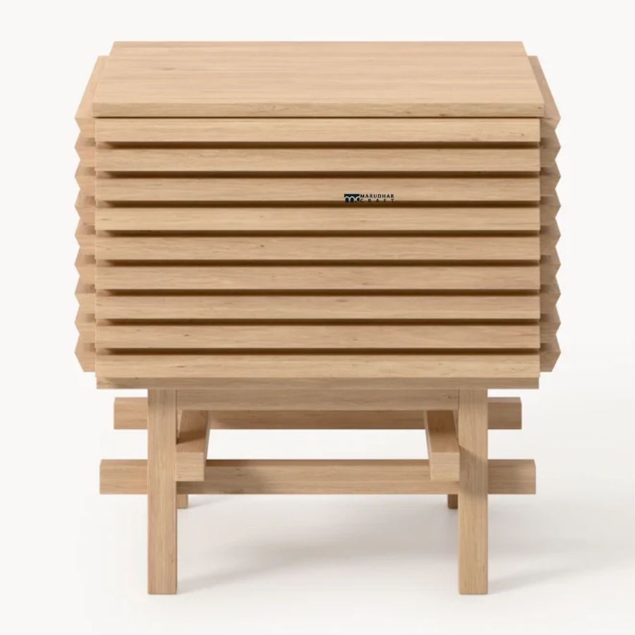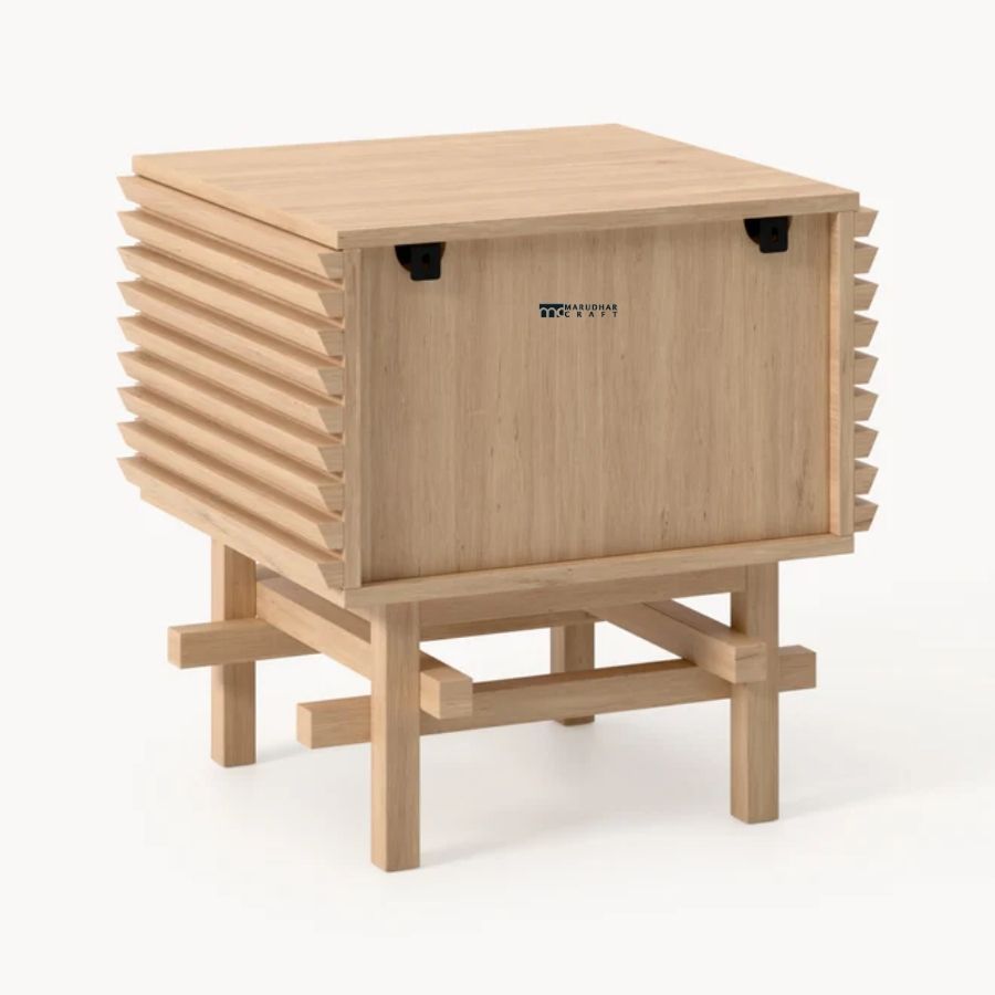 Embrace architectural simplicity with this stunning Japandi-style nightstand. Defined by its rhythmic, horizontal slatted design, this piece brings a sense of calm and organic texture to the modern bedroom. The light natural wood finish highlights the fine grain, while the unique cross-brace pedestal base adds a touch of structural artistry, making it a functional masterpiece for minimalist interiors.