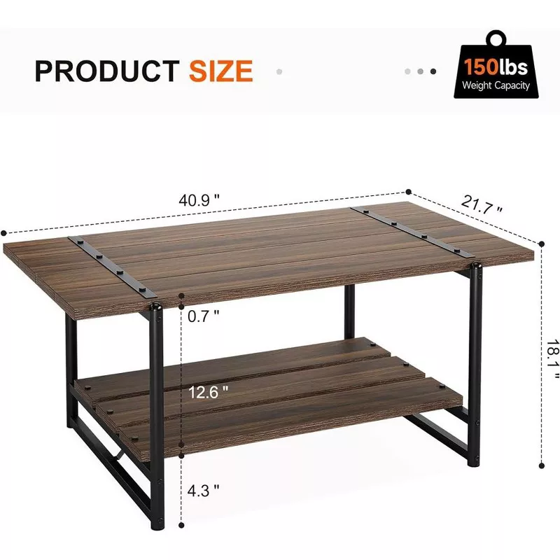 Large Wood Coffee Table with Shelf, Modern Rustic Metal Rectangle Center Table for Living Room